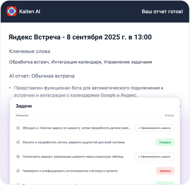 ИИ автоматически выделит ключевые договоренности и решения. Вам больше не нужно лихорадочно конспектировать