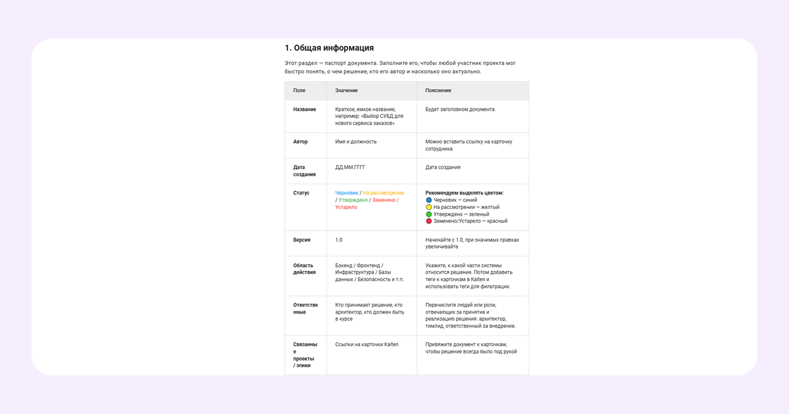 Когда применять: при выборе технологии, фреймворка, паттерна или инструмента. Документ полезен при вводе новых сотрудников в проект и при ревью сложных изменений — не нужно восстанавливать контекст по перепискам.