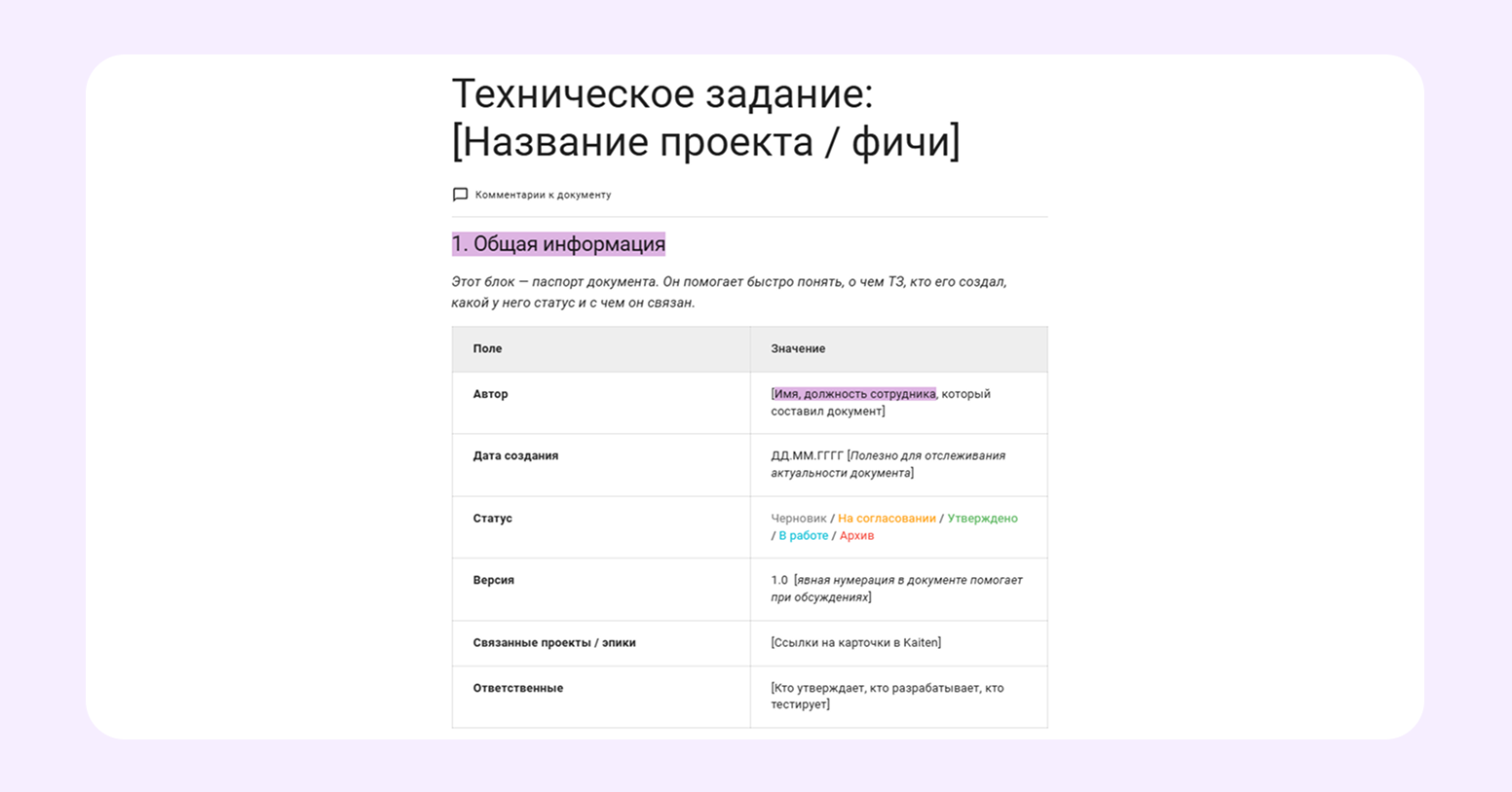 - Комментарии с упоминаниями. Оставляйте замечания в документе или в комментариях карточки и отмечайте автора через @ — так обсуждение остаётся в контексте задачи и не теряется.