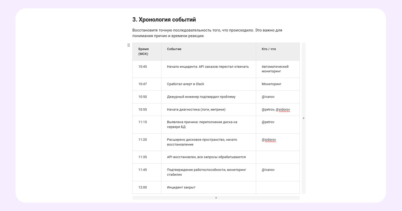 Когда применять: после любого значимого сбоя в работе системы — даже если его не заметили пользователи. Документ помогает не только устранить проблему, но и снизить риск повторения.