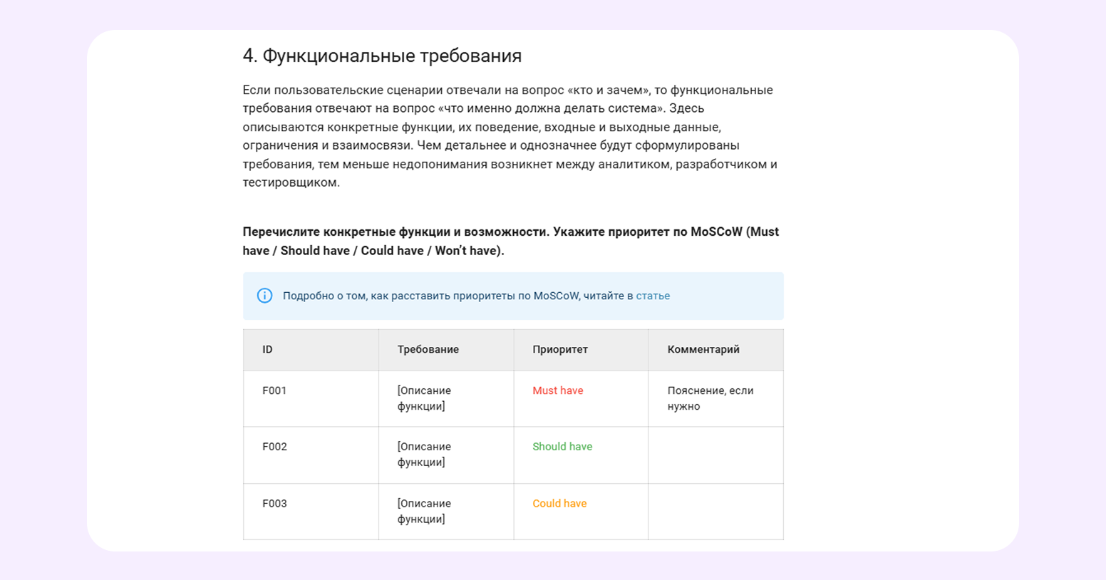 Зачем: чтобы разработчик, тестировщик и менеджер одинаково понимали результат. Без фиксированных требований ожидания расходятся и работа заканчивается правками и спорами.