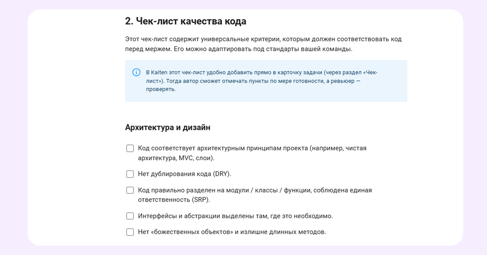 Зачем нужен: чтобы ревью было предсказуемым. Команда проверяет код по одним критериям, меньше спорит о формате замечаний и не теряет комментарии в чатах.