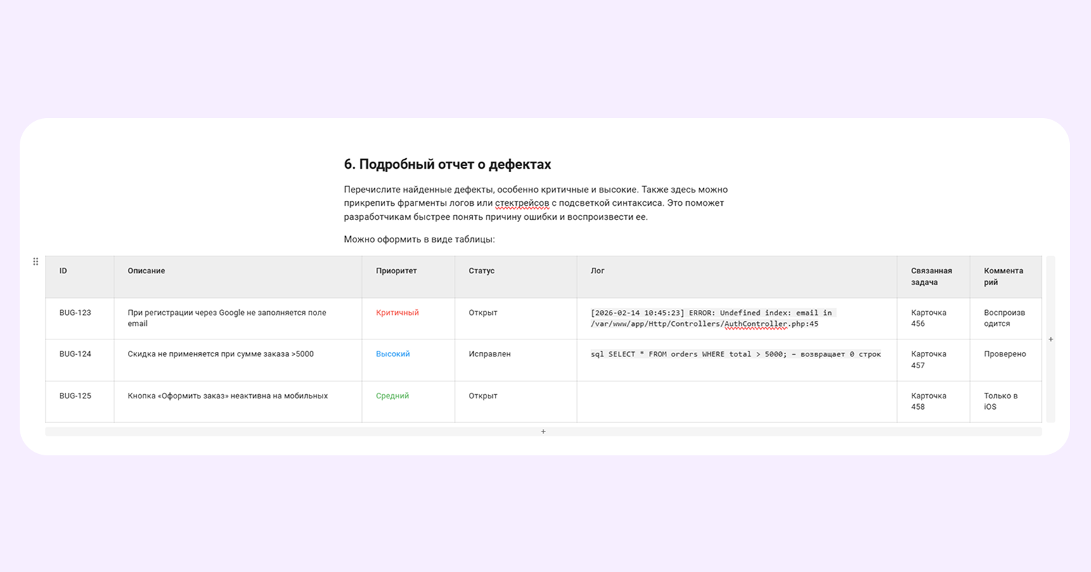 - Вставка кода с подсветкой синтаксиса. Вставляйте в отчет заметные фрагменты кода: логи ошибок, стектрейсы, примеры автотестов или SQL-запросы.