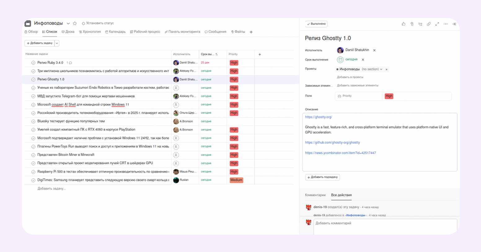 Также можно посмотреть весь список задач и оценить, что происходит: какие задачи в работе, какие были закрыты и как давно.