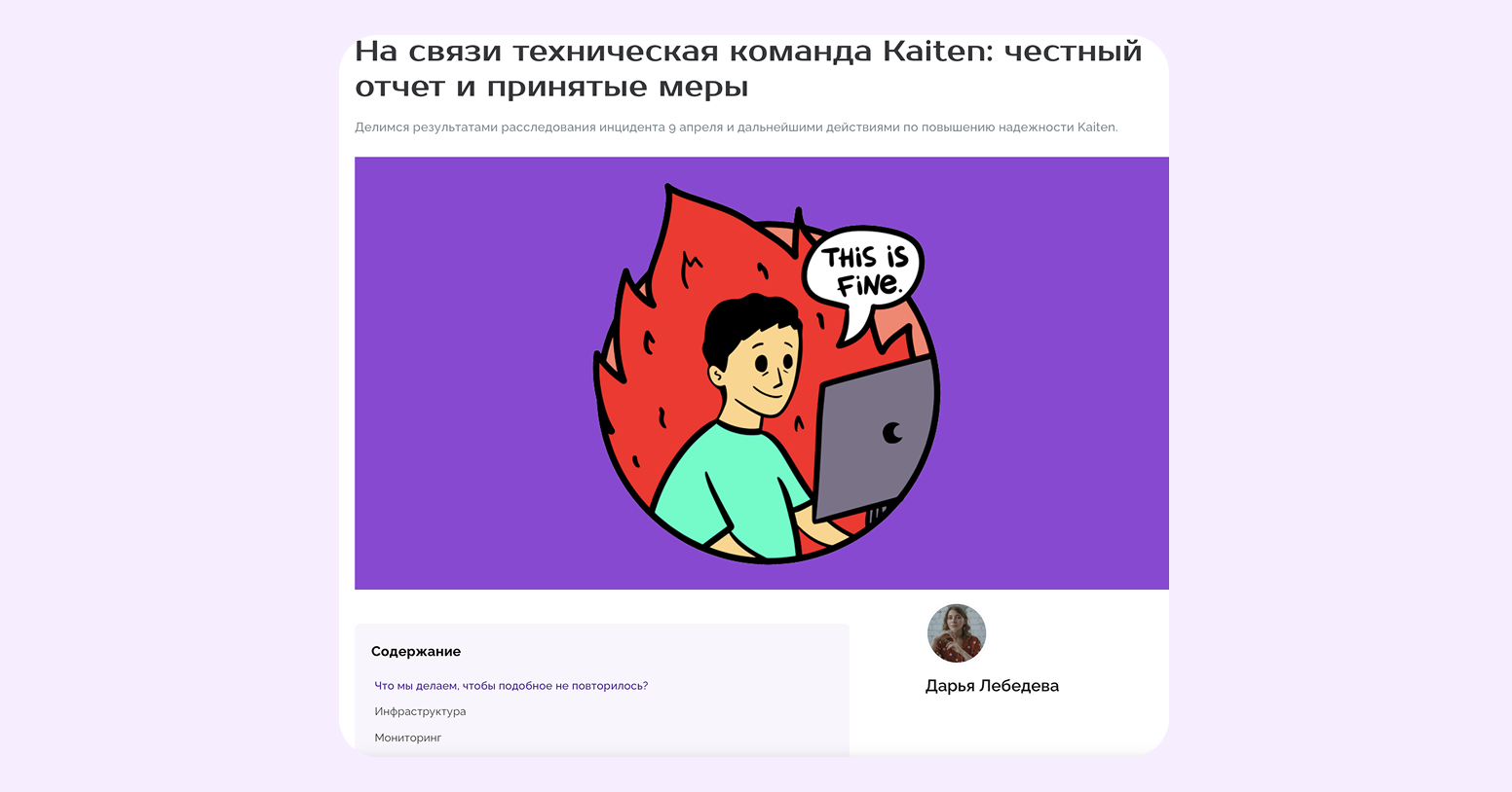 В период активного тестирования нового таск-трекер помогала служба поддержки Kaiten — они оперативно отвечали на вопросы и помогали разобраться. Когда несколько раз «падал» сервис, команда сразу разбиралась с проблемой, а позже опубликовала подробный отчет по инциденту.