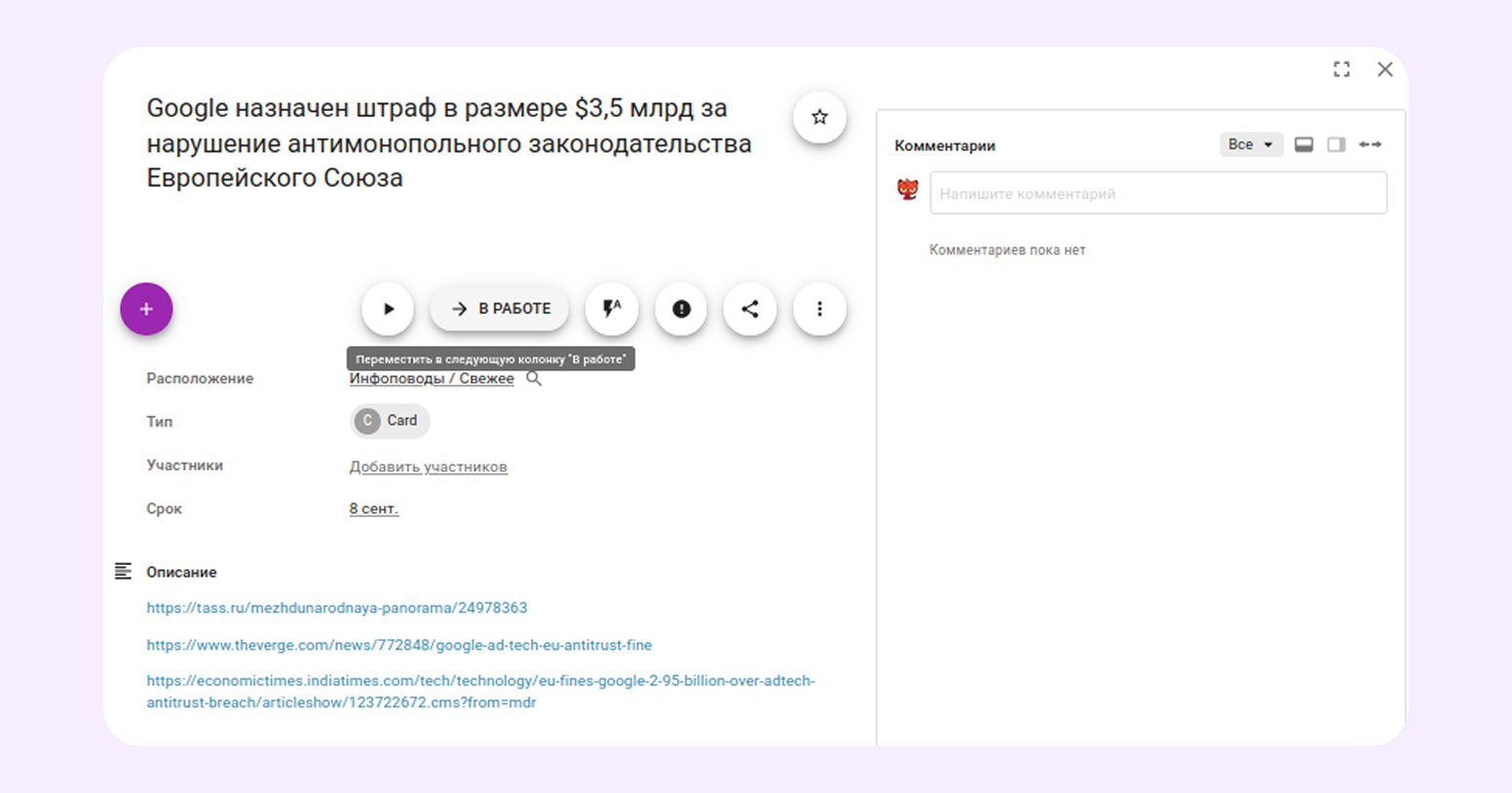 Теперь новый инфоповод создается как карточка в колонке «Свежее». Автор, который берет задачу, переводит ее в «В работе». Когда материал готов и опубликован — таск отправляют в колонку «Готово», а затем он автоматически уходит в архив. Процесс работы такой же прозрачный и понятный как в Asana и даже удобнее.