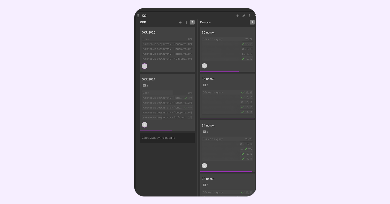 Чтобы управлять достижением целей, мы используем методику OKR. В начале каждого потока проставляем цели, показатели и значения, которых хотим добиться, описываем результат и ищем показатели, которые на него влияют. Все это заносим в Kaiten, а в конце потока собираемся и смотрим, чего добились.