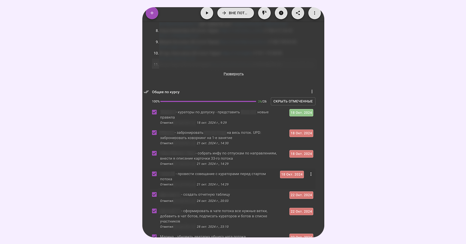 На каждый поток обучения заводили по одной карточке. Это были просто карточки без меток и названиями по типу «31 поток». Внутри каждой из них проставляли ответственных, дедлайны и списки задач. Например: