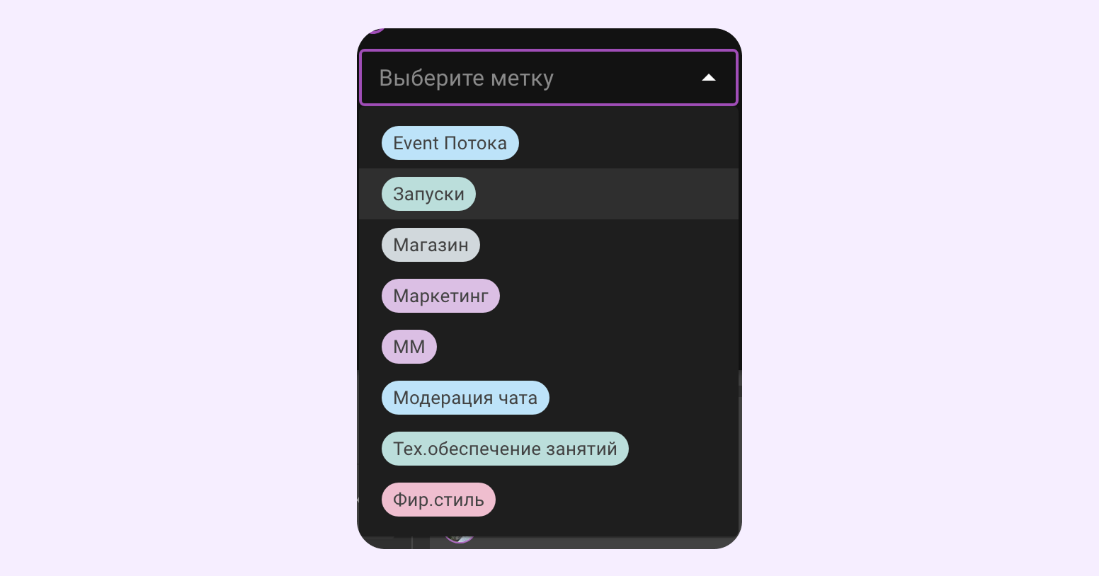 У нас много направлений, поэтому завели метки — каждому направлению соответствует метка. Сейчас меток 14, по каждой их можно посмотреть ход выполнения задачи.
