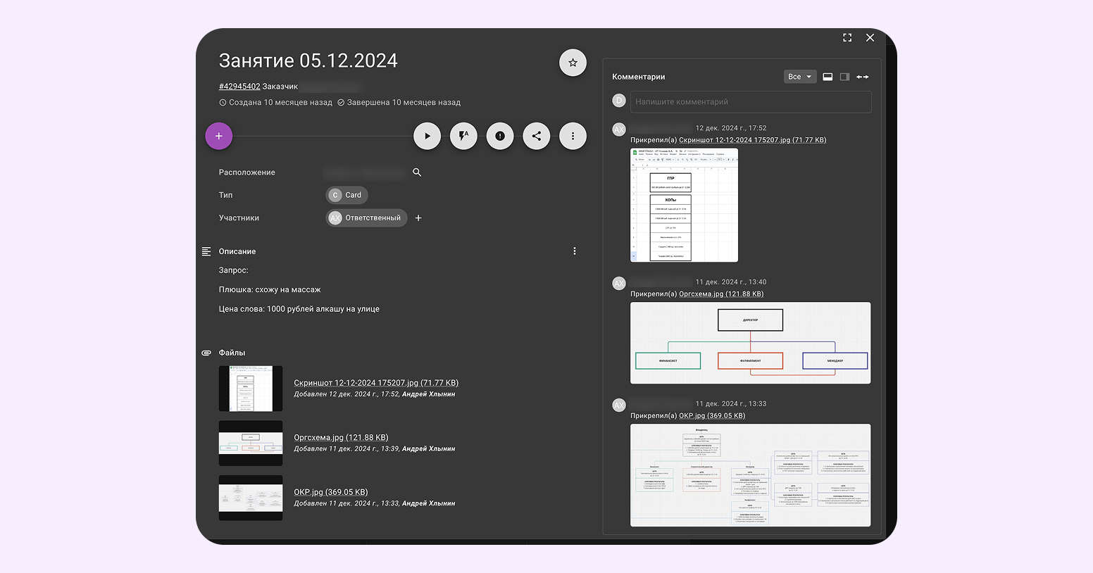 4. Перед созвоном ученик пишет, что сделал. Для этого прикладывает в задачи файлы, скриншоты, ссылки на презентации. Это важно не только для проверки с нашей стороны, но и для самого предпринимателя — в любой момент он может вернуться к задачам и посмотреть свой прогресс.