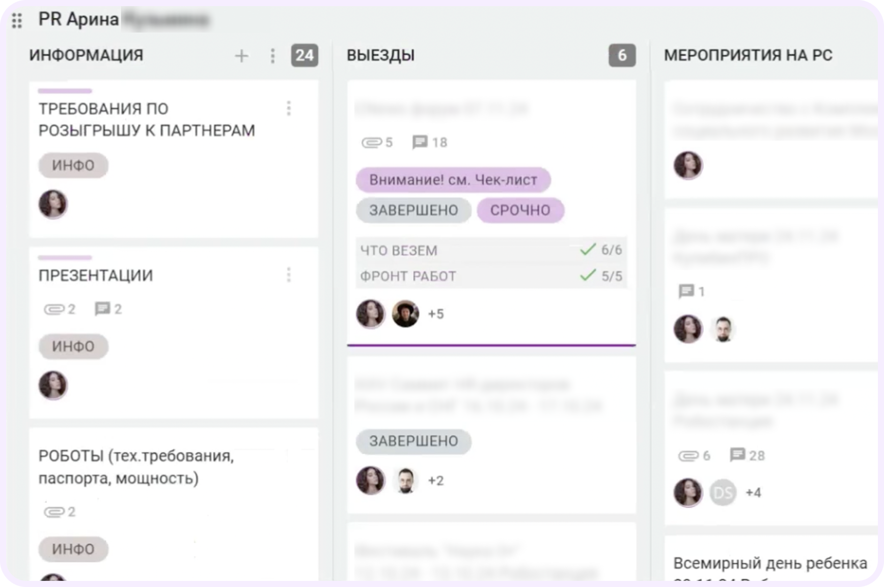 PR-доска формировалась постепенно. Изначально у PR-директора Арины была личная доска, где она хранила презентации, фиксировала мероприятия и требования.