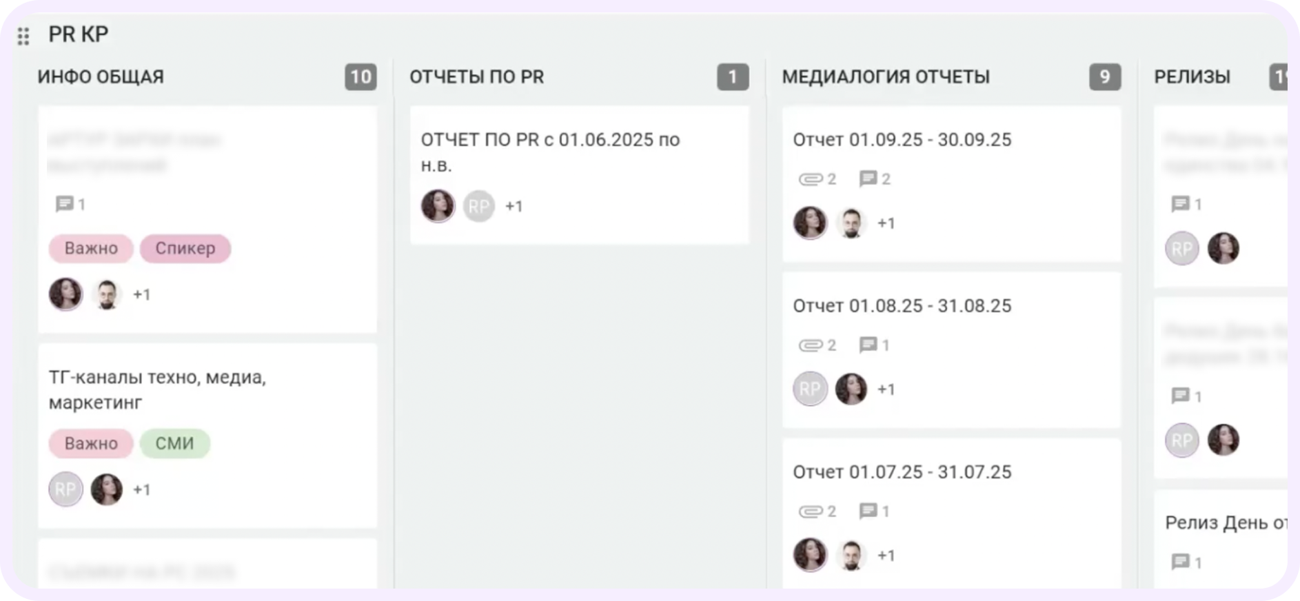 Когда в PR пришел второй специалист, командной работе потребовалось общее пространство. Вместо стандартной схемы «Очередь → В работе → Готово» колонки собрали под реальные задачи отдела — так, чтобы на доске была видна полная картина.
