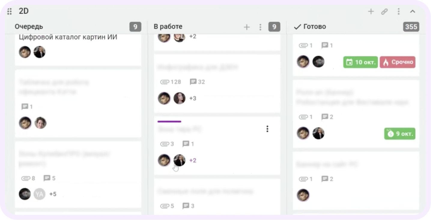Там используют классический канбан с 3 этапами («Очередь», «В работе», «Готово»), важное помечают меткой «Срочно», а детали обсуждают прямо внутри карточек.