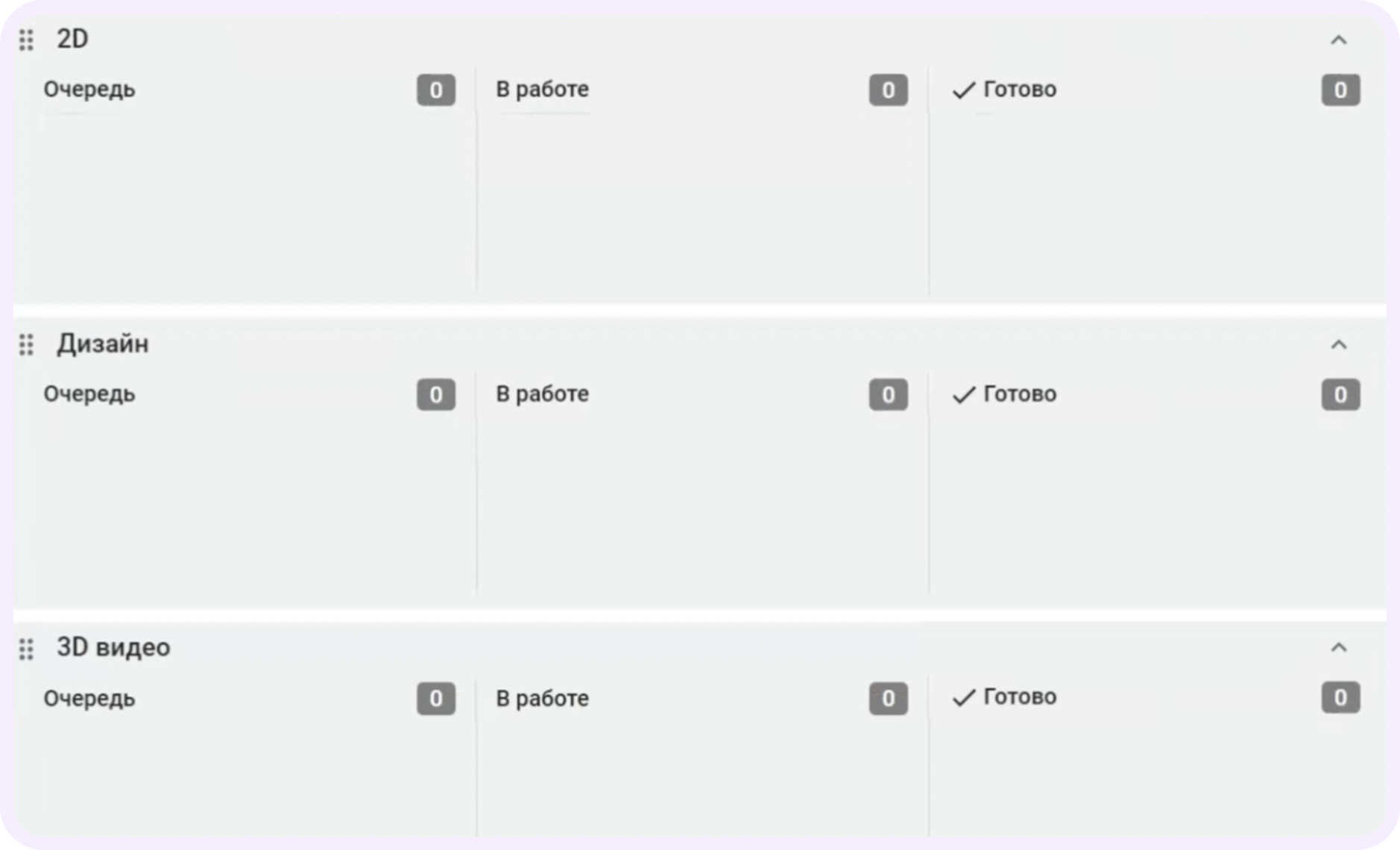 Кроме PR, отдельные пространства есть у маркетинга, управления выставкой, дизайна и других направлений. Например, у дизайнеров сделали 3 доски, чтобы задачи по разным потокам не смешивались.