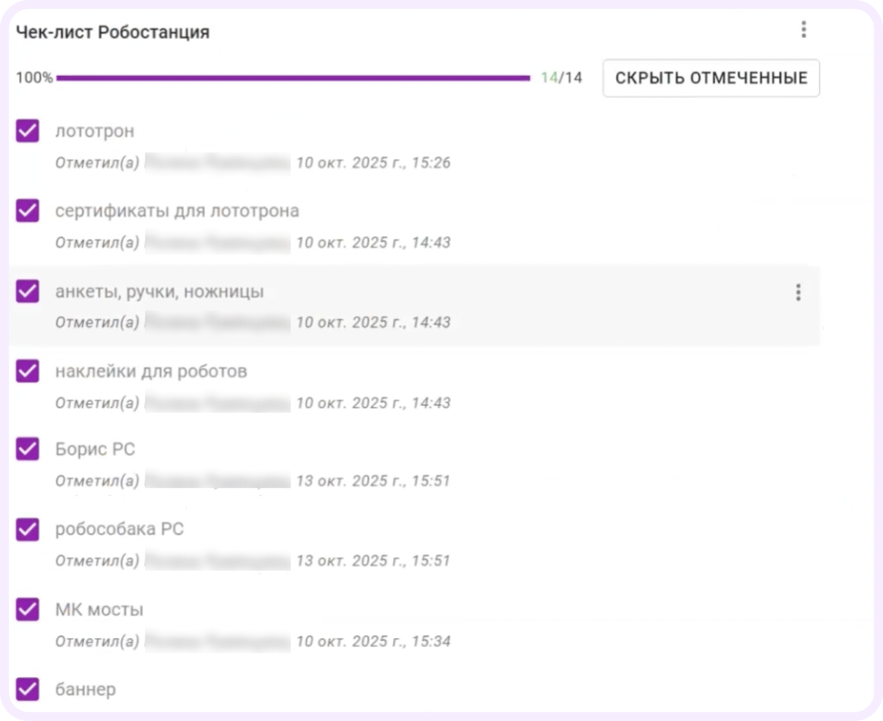После события в карточки добавляют фотоотчеты. Завершенные выезды помечают меткой «Прошло» — так сразу видно, что уже сделано, а что впереди.