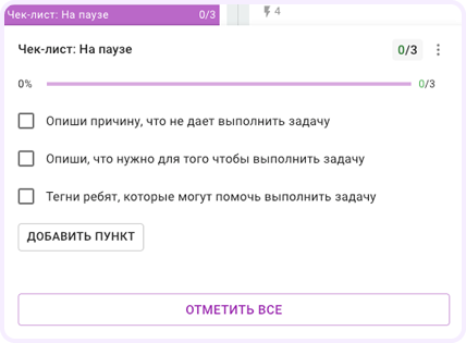 В карточках есть чек-листы: каждый пункт — это этап работы (например, «В работе», «На паузе», «На доработке»). Настроили автоматизацию, которая не позволяет сдвинуть задачу дальше, пока чек-лист не заполнен.