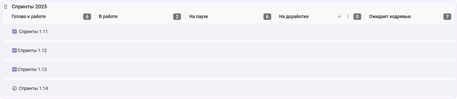 Если задача стала неактуальна, отправляем ее в столбец «Отмена». Когда не укладываемся в сроки, переносим карточки в колонку «Не успели». Так видно, где возникают сложности и срывы дедлайнов, а в конце спринта можно проанализировать данные и улучшить процесс.