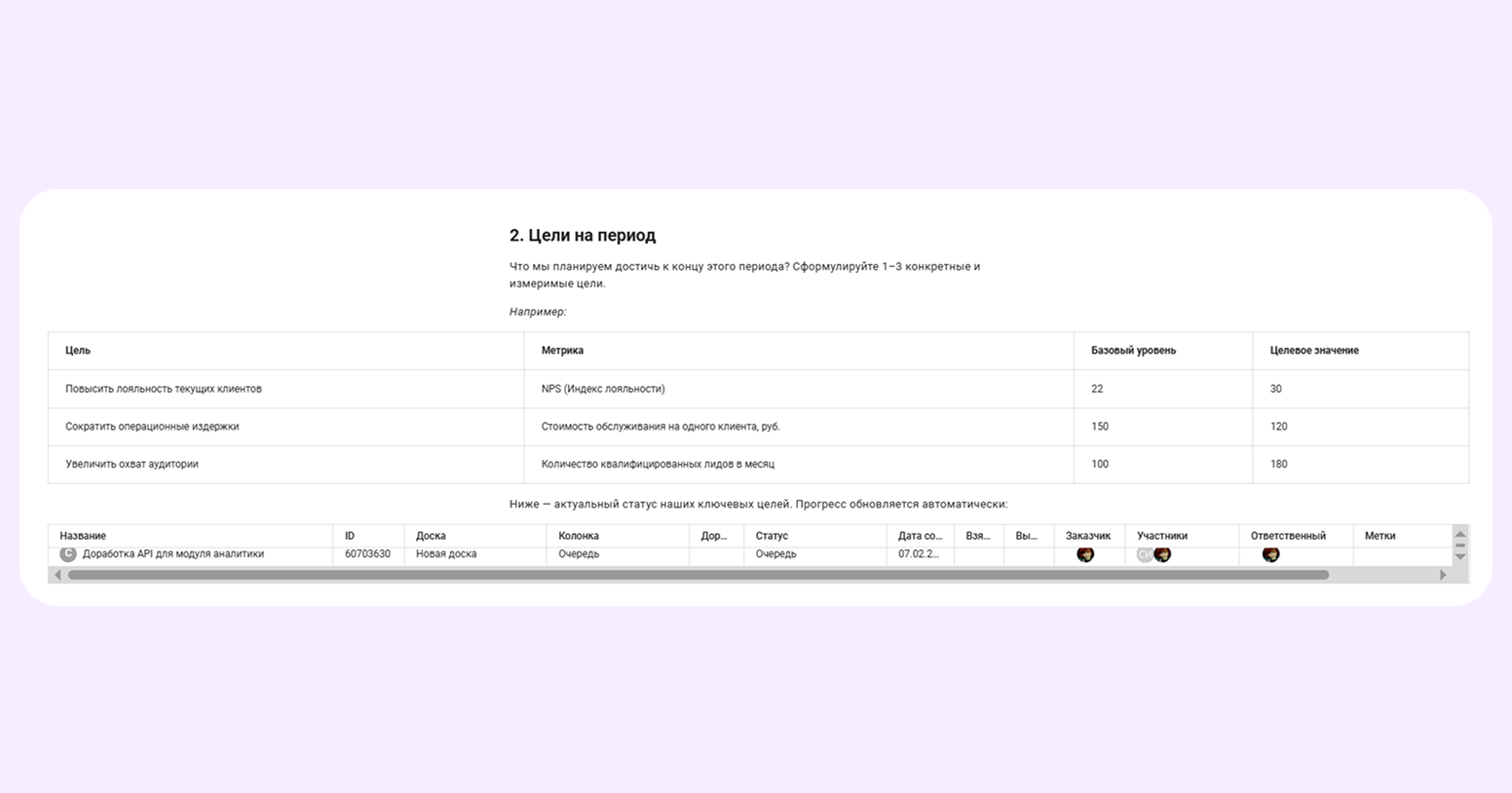 Под таблицей прямо в документе можно добавить доску Kaiten с этими целями, чтобы визуализировать их статус: в работе, достигнута, под угрозой.