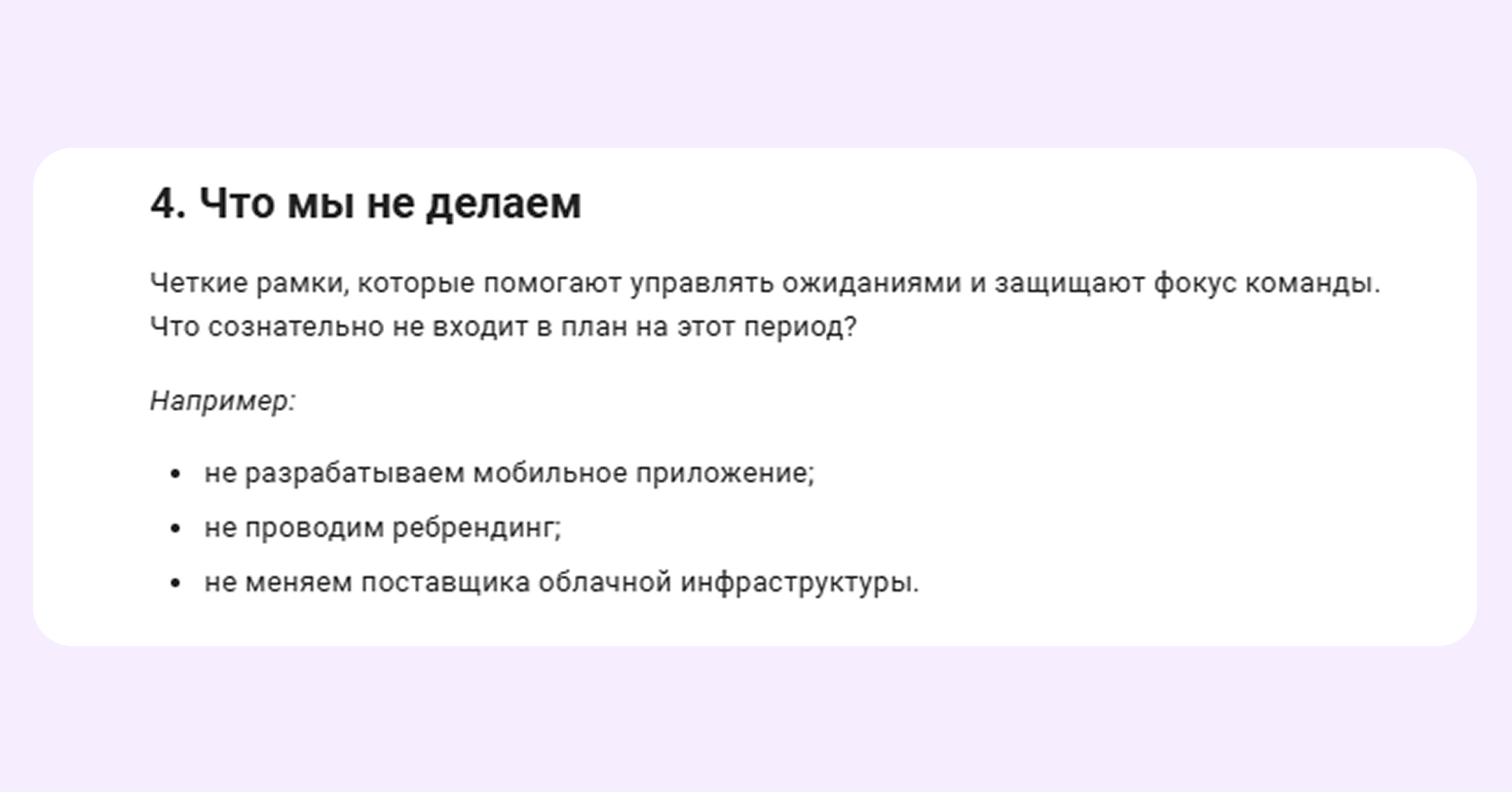 Чего мы не делаем. Этот раздел фиксирует фокус команды. В нем вы записываете запросы и идеи, которые сознательно не берете на этот период.