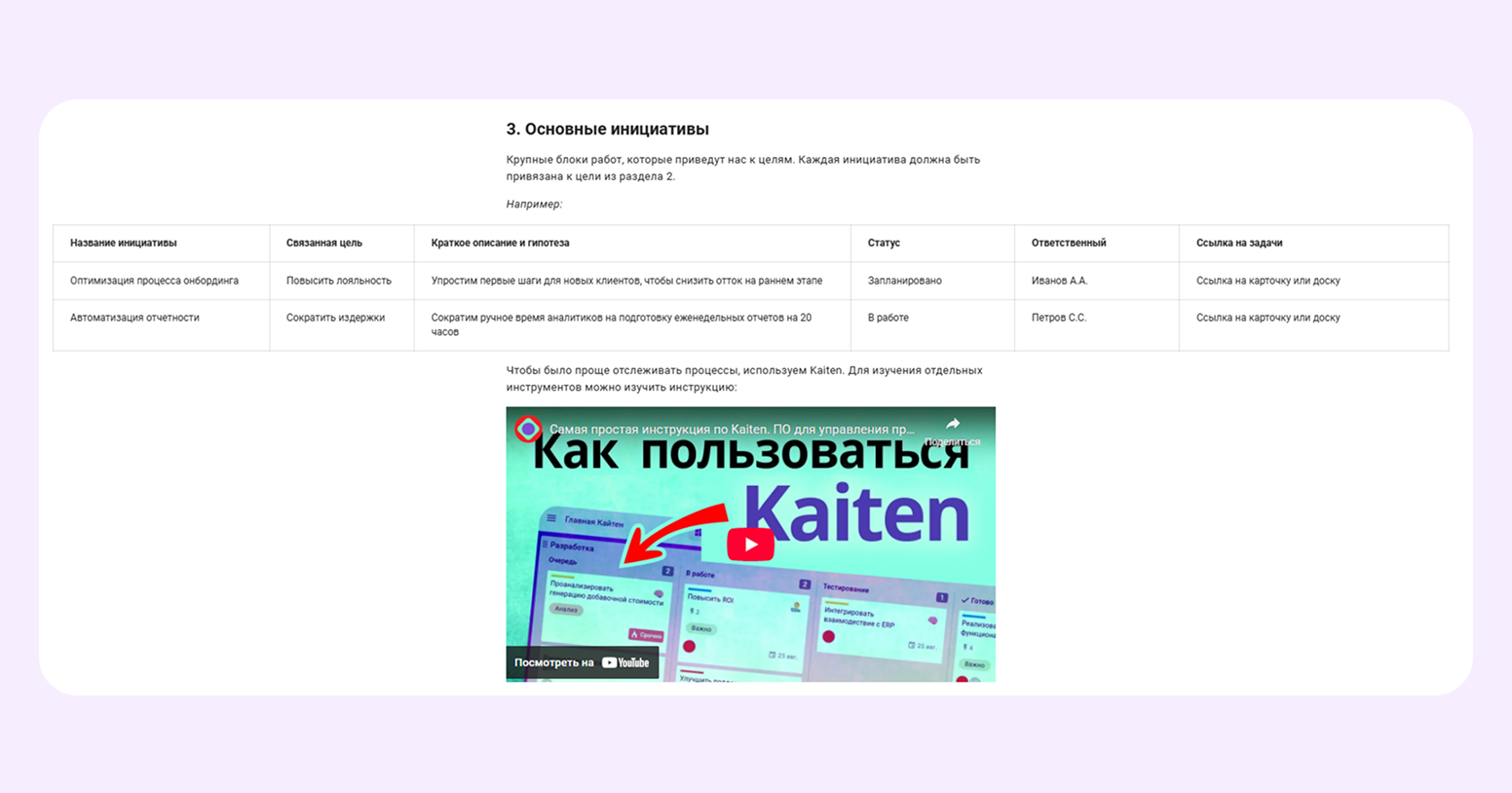 Основные инициативы. Каждая инициатива — это крупный блок работ (эпик), связанный с одной из целей. В таблице фиксируют описание, владельца, статус и ключевое — ссылку на эпик/доску с задачами в Kaiten.