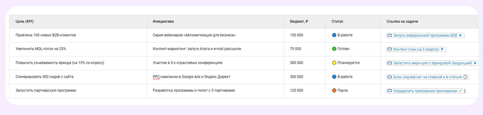 Маркетинг и Growth-отделы используют шаблон как план кампаний: он помогает связать действия с ожидаемым результатом. Вместо списка «сделать пост, запустить рассылку» они определяют цель: например, привлечь 100 корпоративных клиентов.