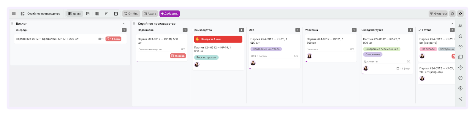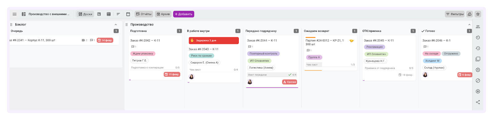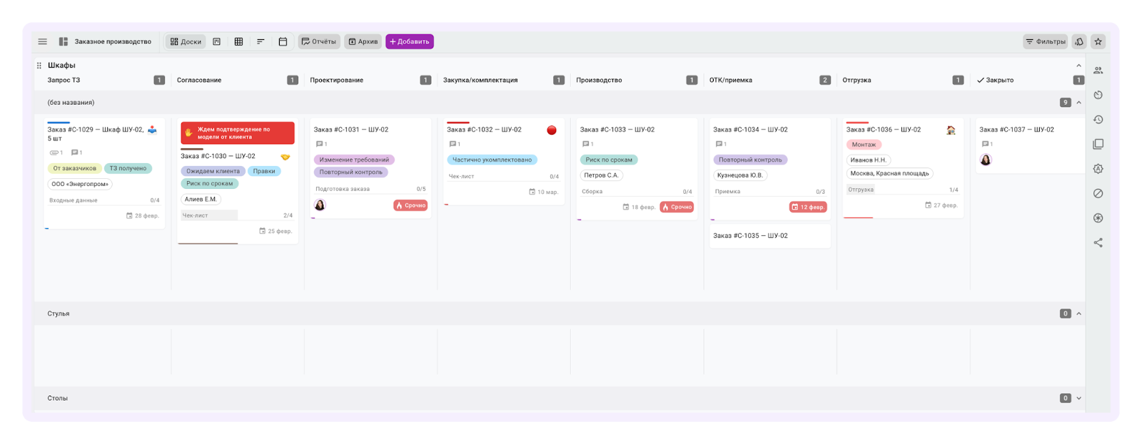 - Актуальная картина по статусам. В любой момент можно открыть доску и понять, что происходит на предприятии.