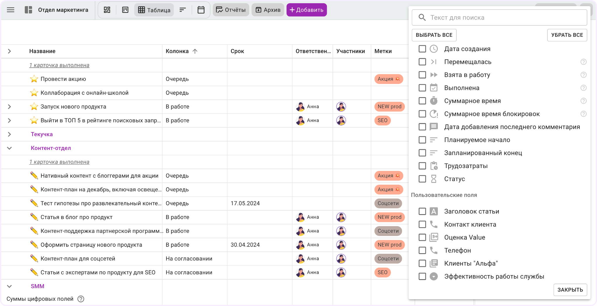 Помимо досок у Кайтена есть другие особенности. Ниже мы рассмотрим их детальнее, а пока отметим табличный вид отображения с гибкими настройками. В таблице пользователям доступен список всех задач на пространстве, а также данные, которые содержатся в карточке. Особенность в том, что вы можете добавить или убрать любые данные из таблицы и настроить ее под себя. Это касается в том числе и кастомных полей. У WEEEK тоже есть подобная настройка, но она ограничена теми полями, которая предлагает сама система.