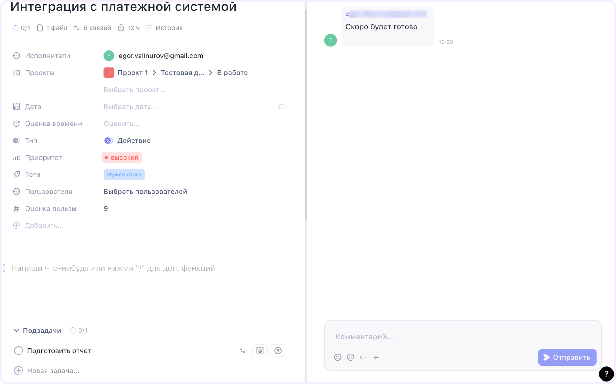 В WEEEK карточки тоже функциональные: кастомные поля, связи между задачами, повторяющиеся задачи, приватность на уровне отдельной карточки. Для большинства базовых сценариев этого хватает, хотя кастомных типов карточек и формул здесь нет. Но есть готовые статусы для приоритетов — не придется создавать такие метки вручную.