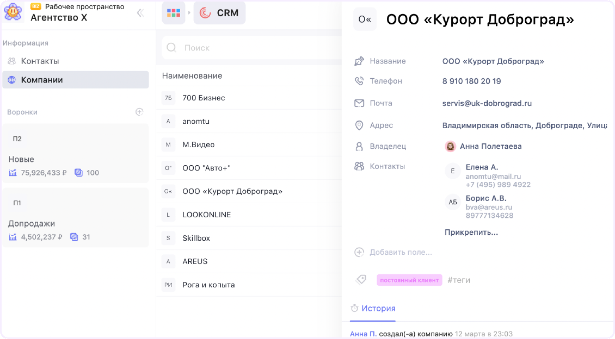 Это сильная сторона WEEEK — особенно для небольших команд, которые не хотят платить за отдельную CRM и вести клиентов в одном сервисе, а задачи в другом. Внутри — база контактов и компаний, воронки продаж с этапами и аналитикой, карточки сделок. Можно отслеживать статусы, сегментировать клиентов, собирать статистику по работе отдела продаж. Сделки связываются с задачами, так что работа по клиенту и внутренние задачи команды живут в одном пространстве.