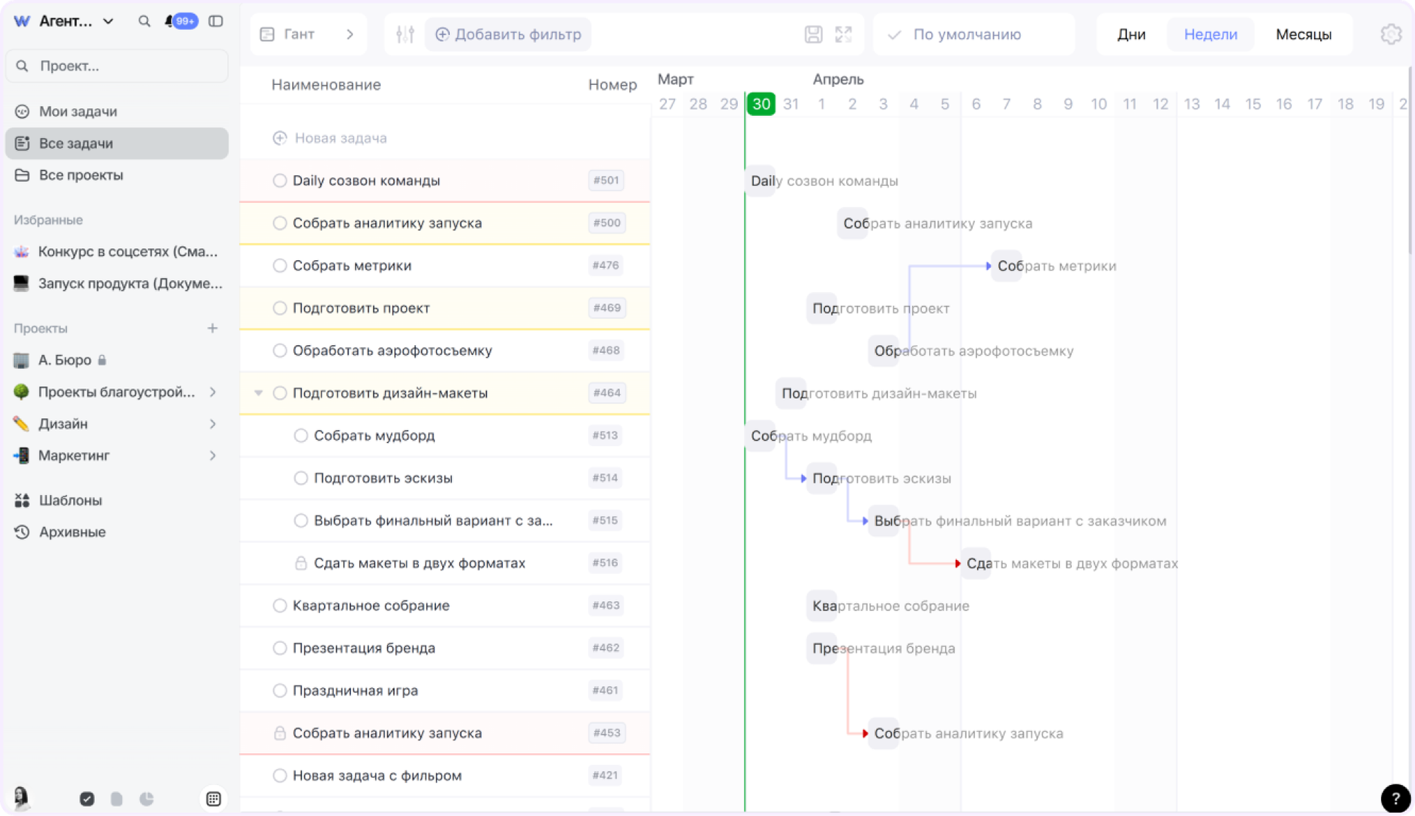 У WEEEK диаграмма Ганта — это отчасти отдельная сущность. Она доступна только в разделе со всеми задачами и со всеми проектами. Не получится отслеживать выполнение задач на пространстве проекта — для этого придется выходить со страницы этого проекта и отдельно включать диаграмму и фильтровать задачи уже там. Это может быть неудобно, когда проектов десятки и нужно переключаться между окнами.