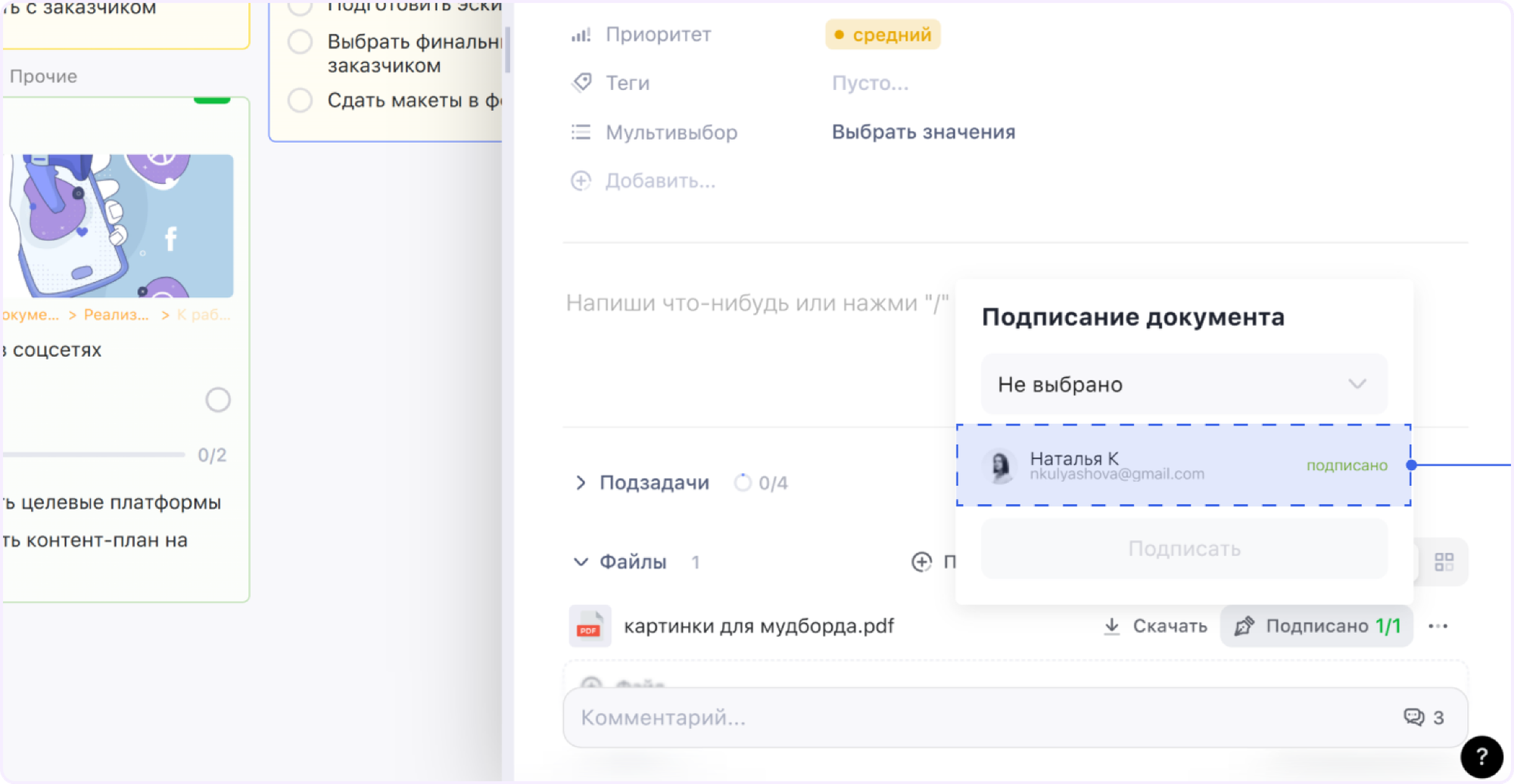 Кайтен предлагает больше возможностей для совместной работы. Вы можете редактировать тексты по тому же принципу, что и в Google Документах: оставлять замечания в конкретных местах, отмечать других пользователей и обмениваться сообщениями в ветке комментария. Также в отдельном поле можно писать общие комментарии к документу.