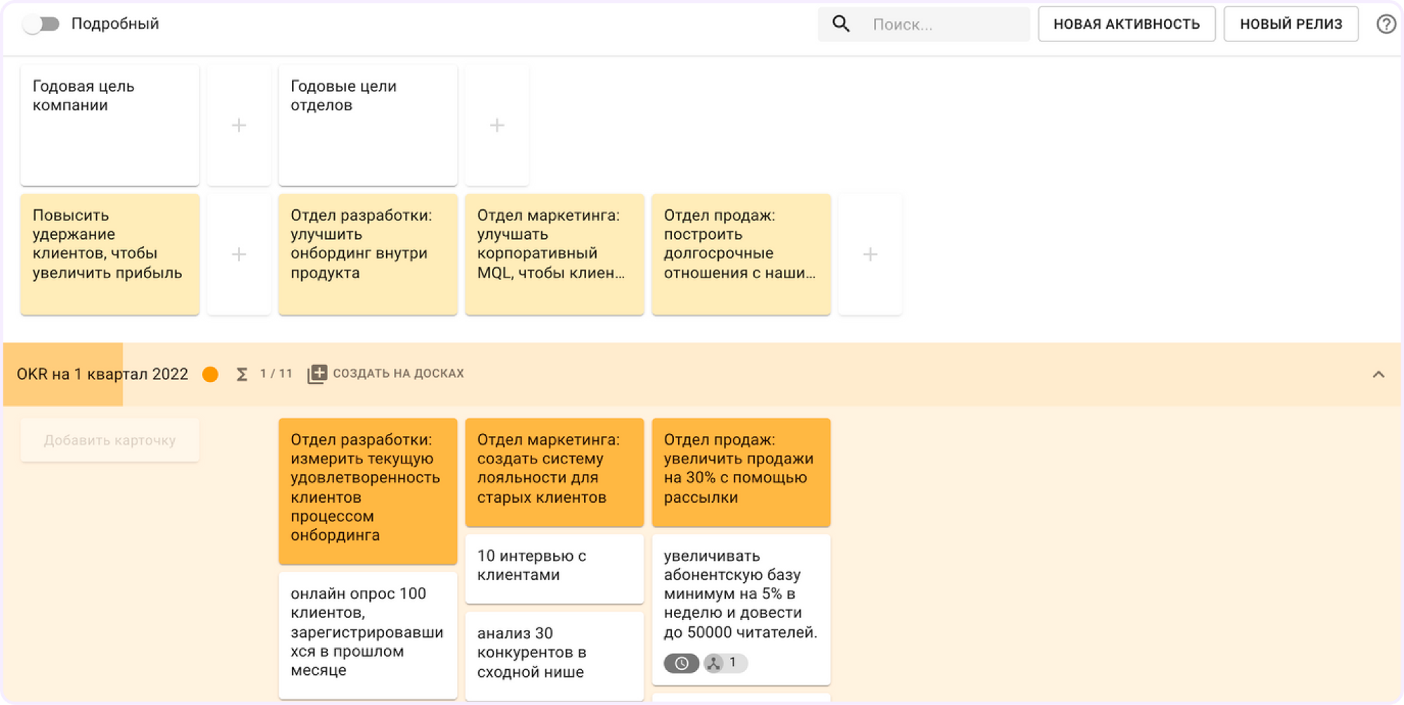 Инструмент для проектирования продукта через призму пользовательского пути. Помогает увидеть общую картину, разложить задачи по этапам взаимодействия пользователя с продуктом и спланировать, что войдет в ближайший релиз, а что подождет. Карточки в User Story Map можно связать с карточками на досках и отслеживать прогресс.