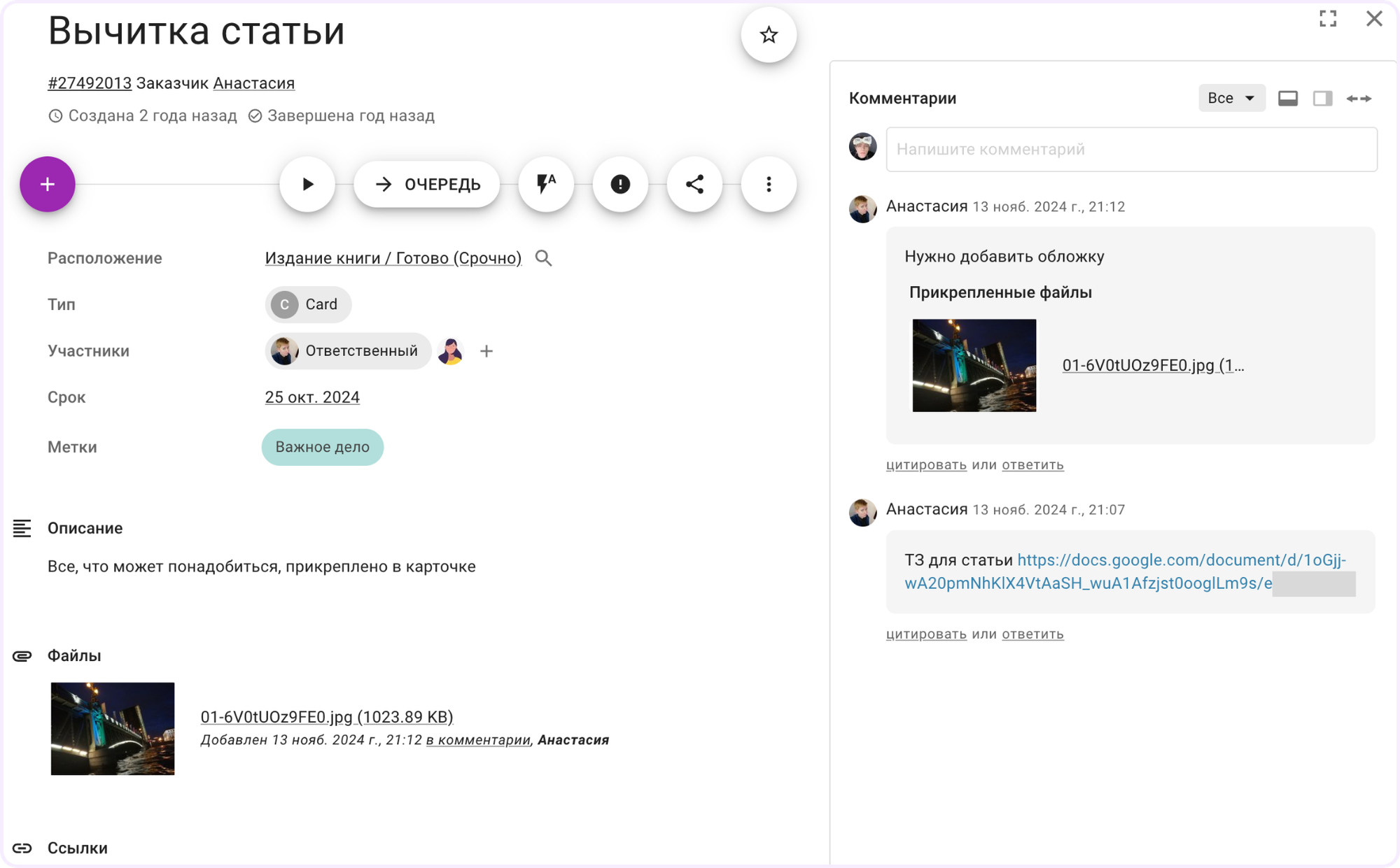 Карточка — это место, где команда проводит больше всего времени: получает вводные о работе, сообщает о выполнении или обсуждает решение. Сравним организацию работы с карточками в обеих системах.