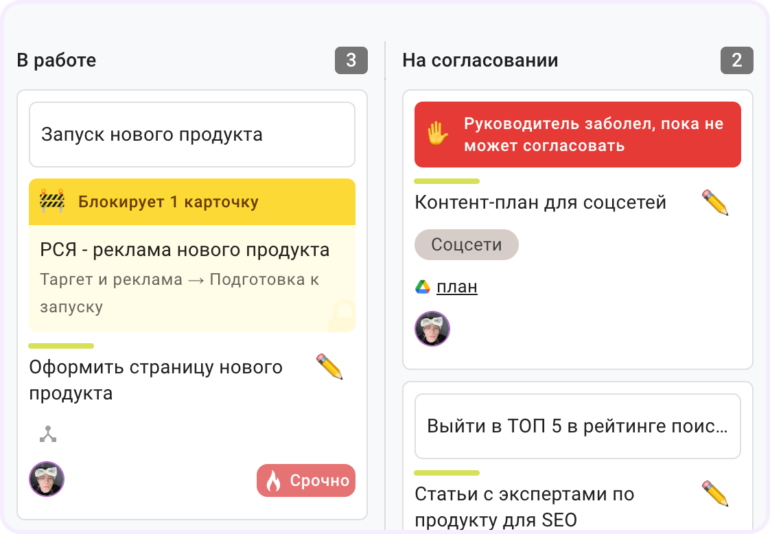Еще одно отличие в блокировках задач. Блокировки нужны для карточек, которые нельзя передвинуть из-за зависимости от других задач или внешних причин: заболел сотрудник, долгое согласование и т. д.