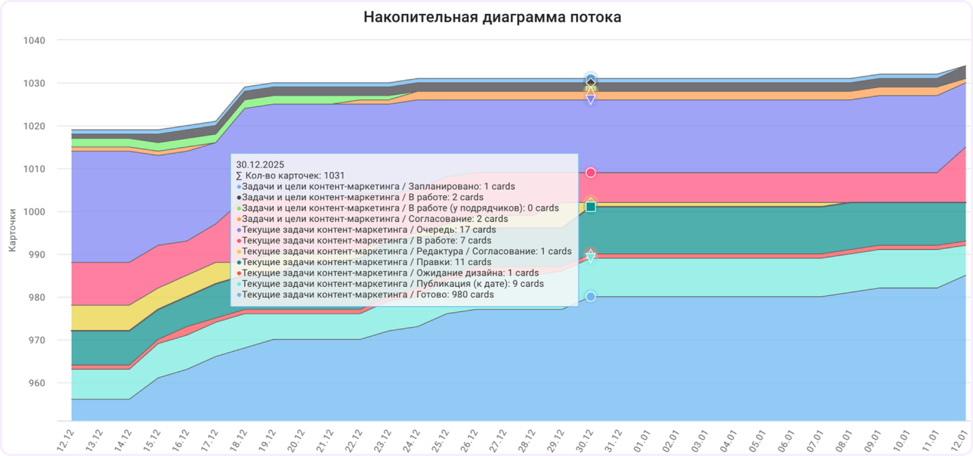 Чтобы понимать, какие именно проблемы могут быть у процессов, в Кайтен предусмотрены специальные отчеты. Они помогают не просто видеть, что происходит, а понимать почему — где процесс буксует, какие этапы занимают больше всего времени и сколько работы команда реально может взять.
