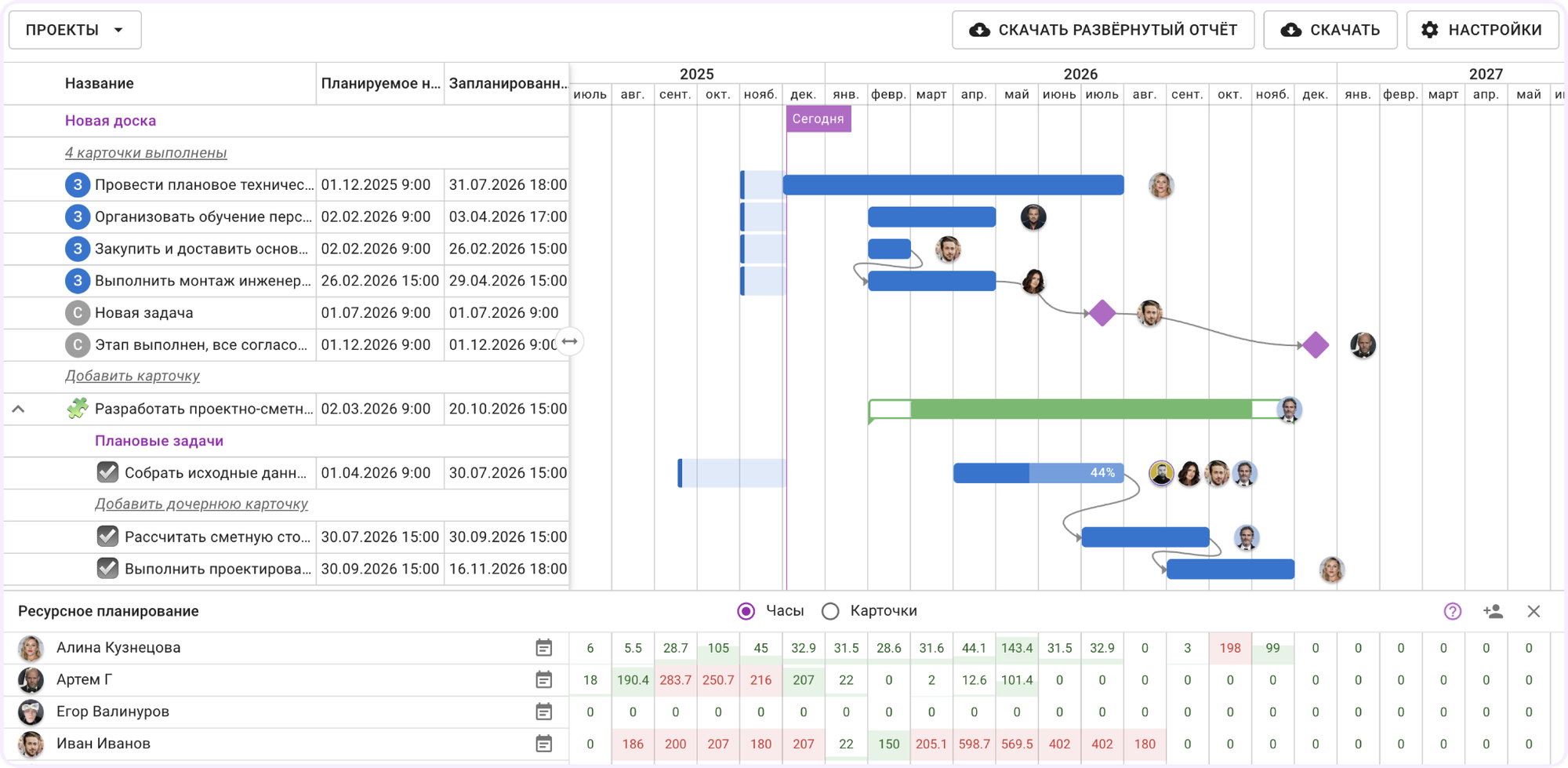 Ресурсное планирование тоже реализовано по-разному. В Кайтене оно тесно связано с диаграммой. Вы можете открыть раздел с ресурсами под временной шкалой и следить за распределением часов или карточек между сотрудниками. Также вы можете увидеть, если поставленные задачи пересекаются с другими задачами сотрудника.