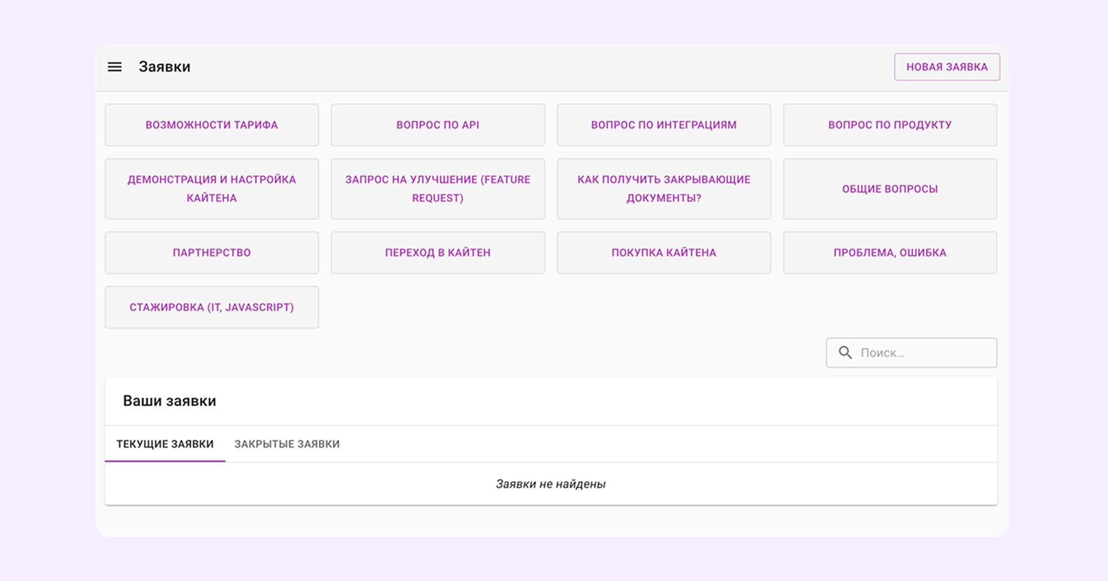 Большинство заявок поступали через собственный модуль Kaiten Service Desk, остальные — по электронной почте. Кнопка-ссылка на портал поддержки уже тогда была интегрирована прямо в интерфейс сервиса.