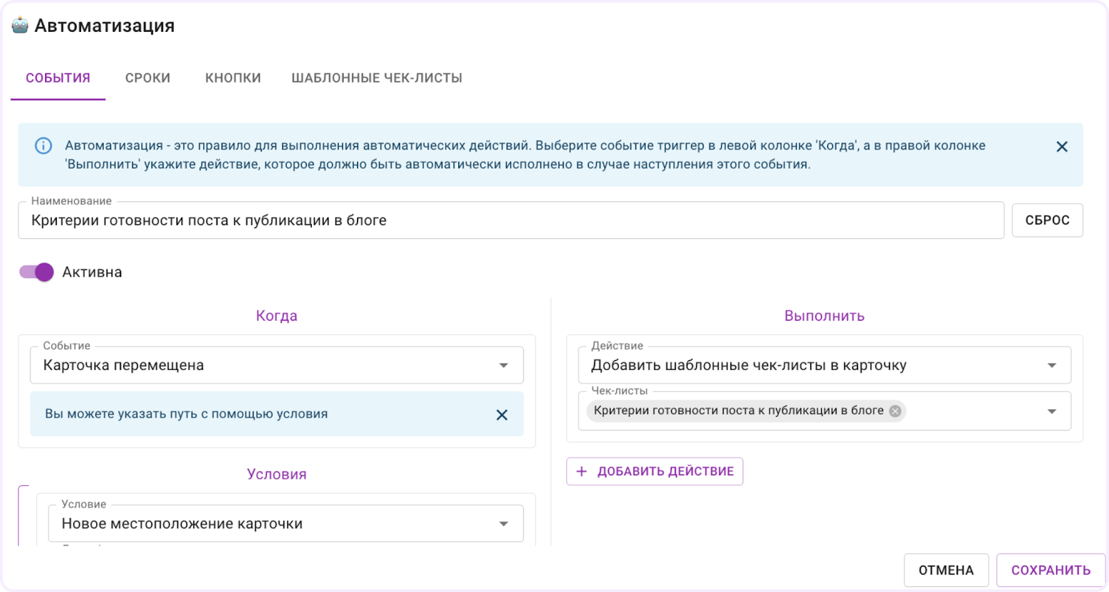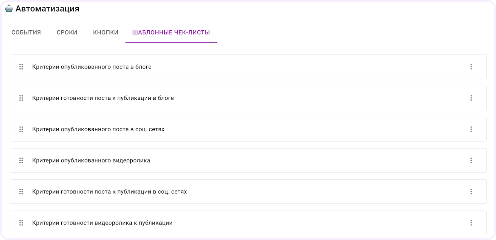 Автоматизации. Сейчас у Игор настроено 5 автоматизаций. Все они завязаны на тип карточки и переход между колонками: когда карточка доходит до нужного этапа, система сама добавляет подходящий чек-лист.