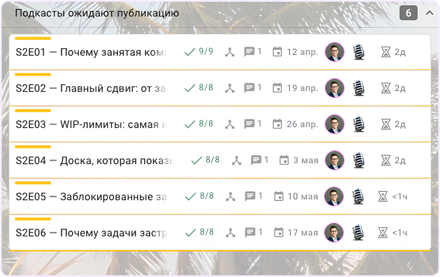 Чтобы все 12 готовых карточек не мешали работать с текущими задачами, Игорь добавил отдельную дорожку «Подкасты ожидают публикацию». Готовые эпизоды уходят туда с проставленной датой, а когда дата подходит, карточка возвращается сразу в колонку выполнения.