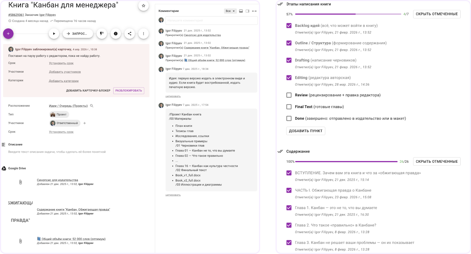Для книги есть отдельная карточка проекта, внутри которой 2 чек-листа: первый с этапами написания, второй — с перечнем глав. Туда же Игорь прикрепляет ссылки на Google Документы с черновиками книги, содержанием и синопсисом для издательства.