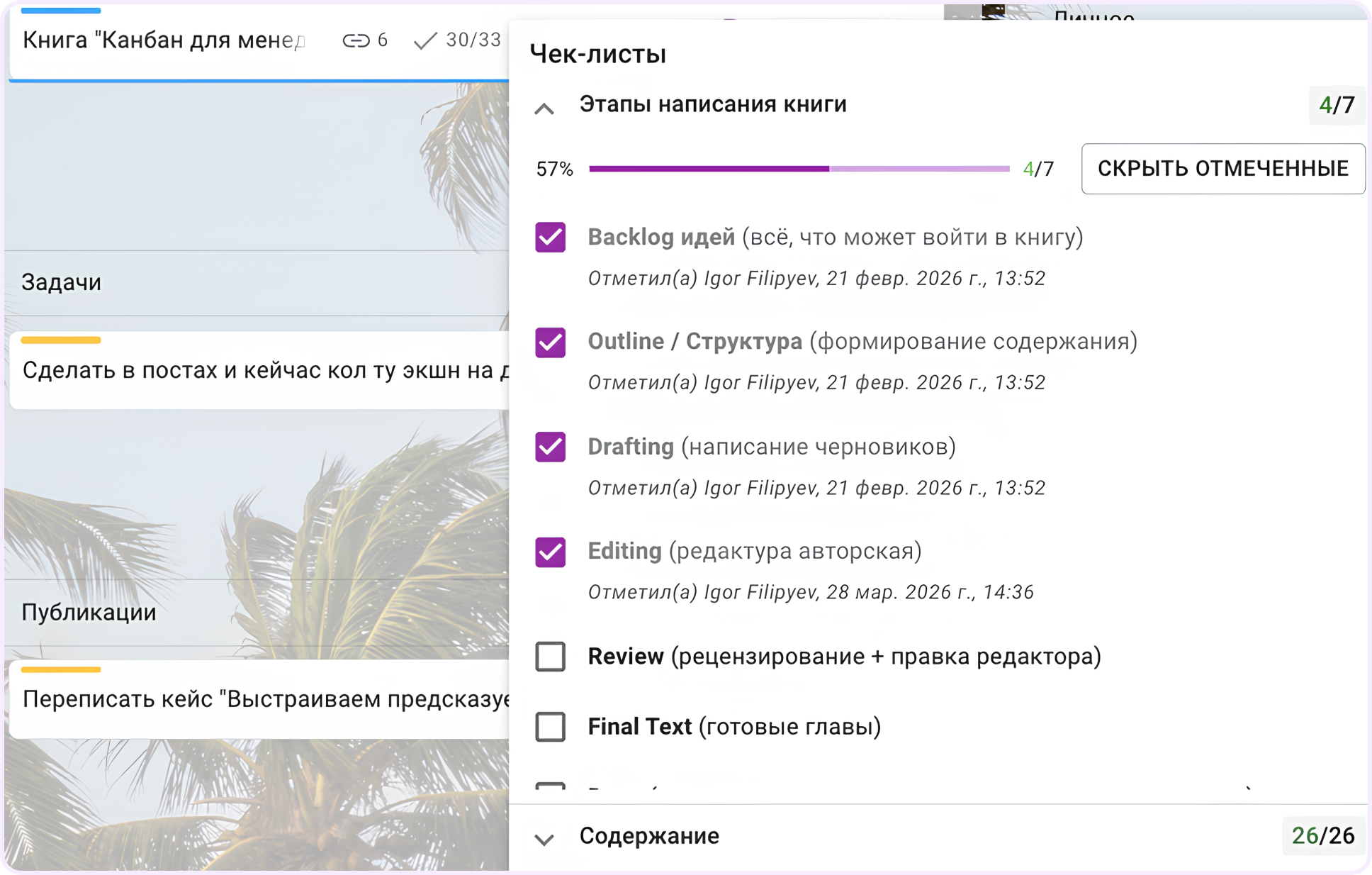 После этого Игорь сменил стратегию: сначала дописал книгу до стадии рукописи, а уже потом решил возвращаться к редактуре. В Кайтене это отразилось просто: готовая глава отмечалась в чек-листе, получала ссылку на документ и уходила в архив.