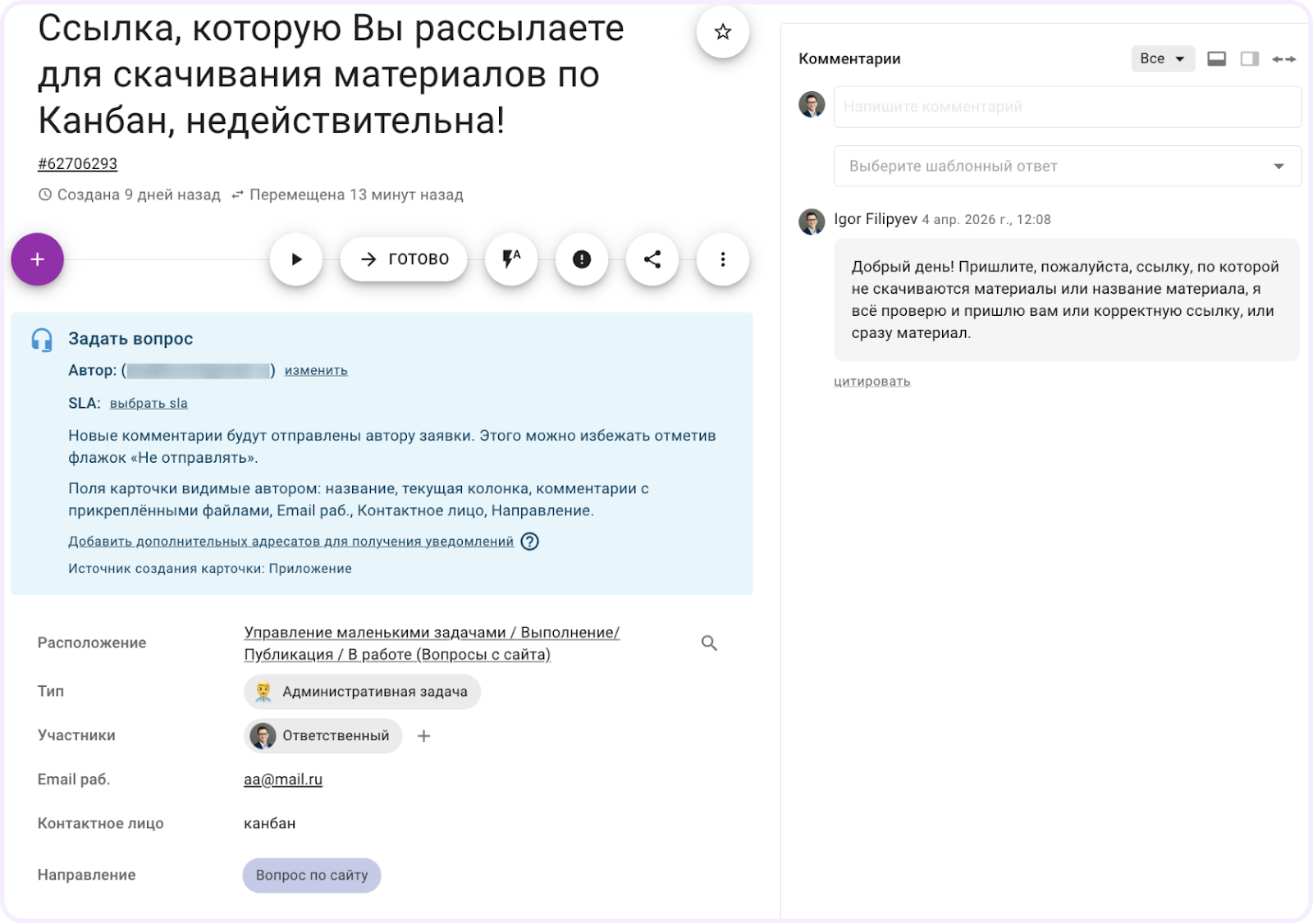 Заявки и вопросы с сайта «Школы Канбана» сами попадают на доску