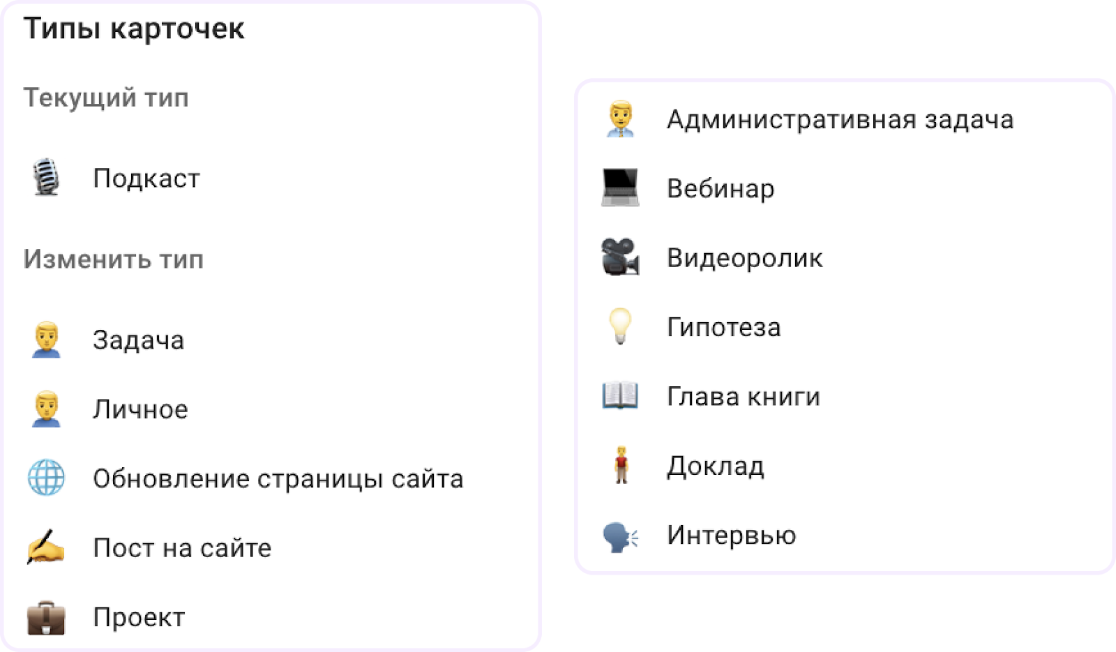 Типы карточек. Для каждого вида контента есть свой тип карточки: пост на сайте, выпуск подкаста, глава книги: