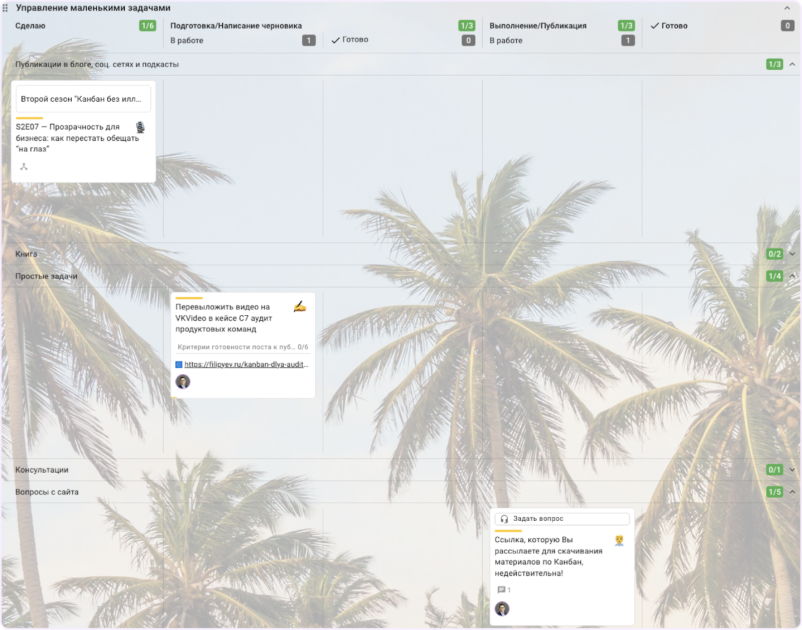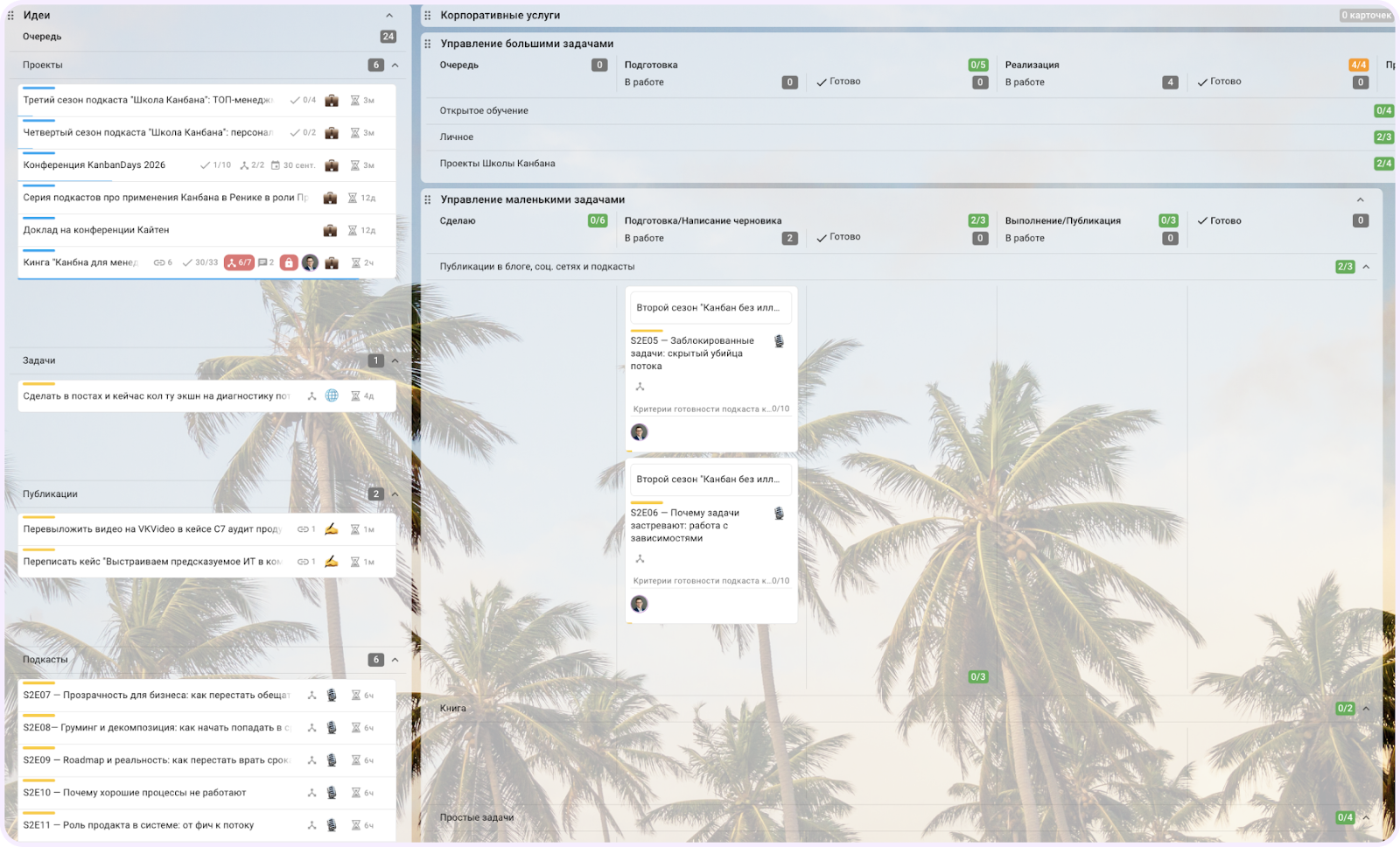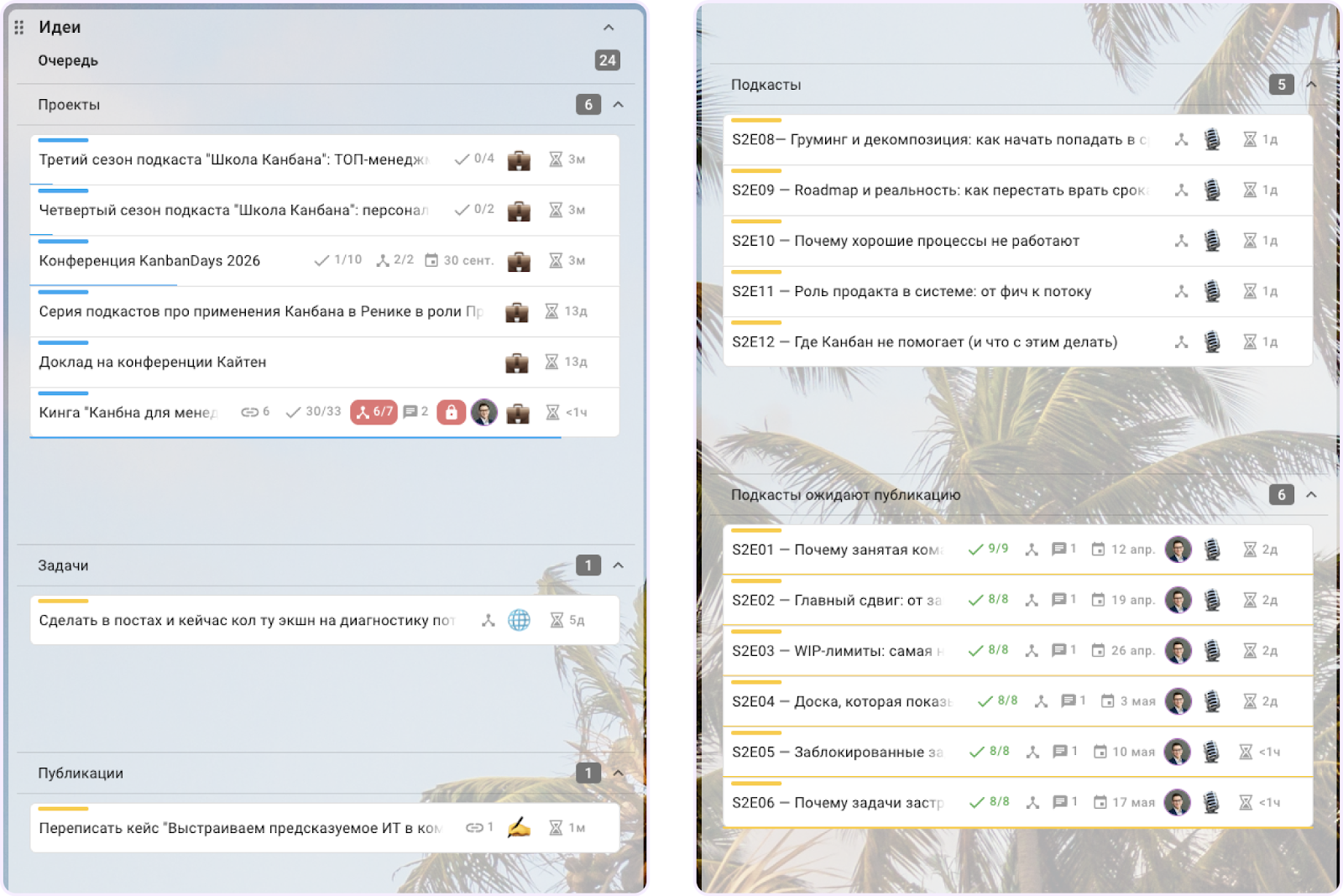 Сегодня Игорь ведет в Кайтене все: «Школу Канбана», подкасты, книгу, заявки с сайта, личные задачи. За 9 лет система стала рабочим пространством, в котором все устроено так, как ему удобно.