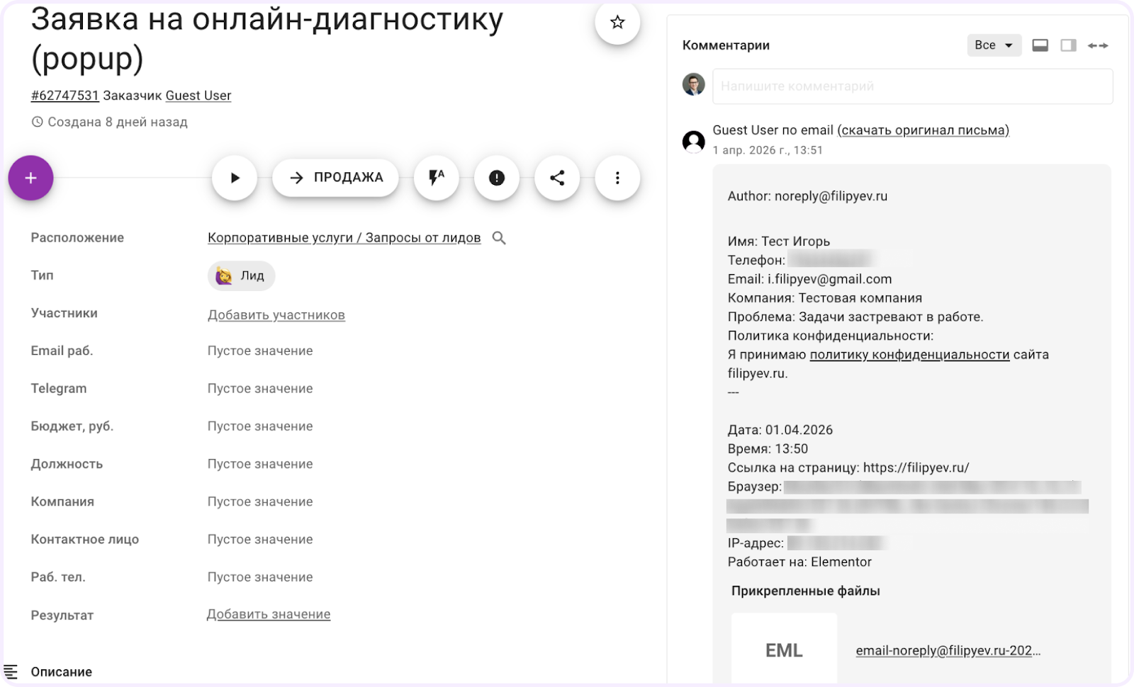 На сайте «Школы Канбана» есть форма обратной связи и почта для обращений — в основном они нужны для заявок от потенциальных клиентов, которые хотят попасть на консультацию. Чтобы не отслеживать заявки вручную и не терять их, Игорь настроил автоматизацию: каждое письмо, которое приходит через форму, превращается в карточку на Канбан-доске.