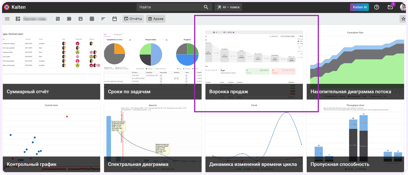 В Кайтен есть отчеты по воронке продаж, которые показывают: