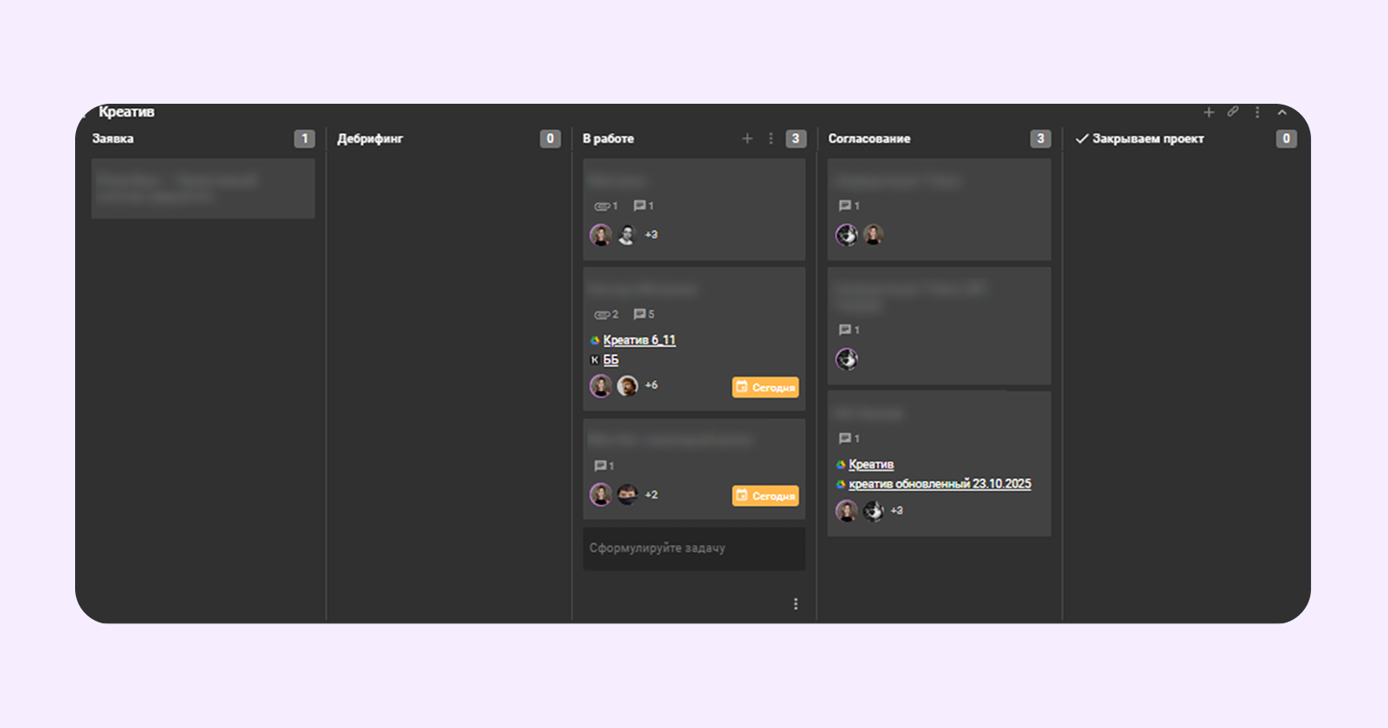 - В работе. На этом этапе карточка находится на доске «Креатив» или переходит в «Производство», если началась реализация.