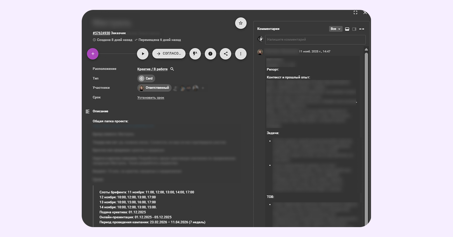 - Основные данные: бюджет, сроки, контакты, задача. Так можно быстро найти и ознакомиться с информацией.