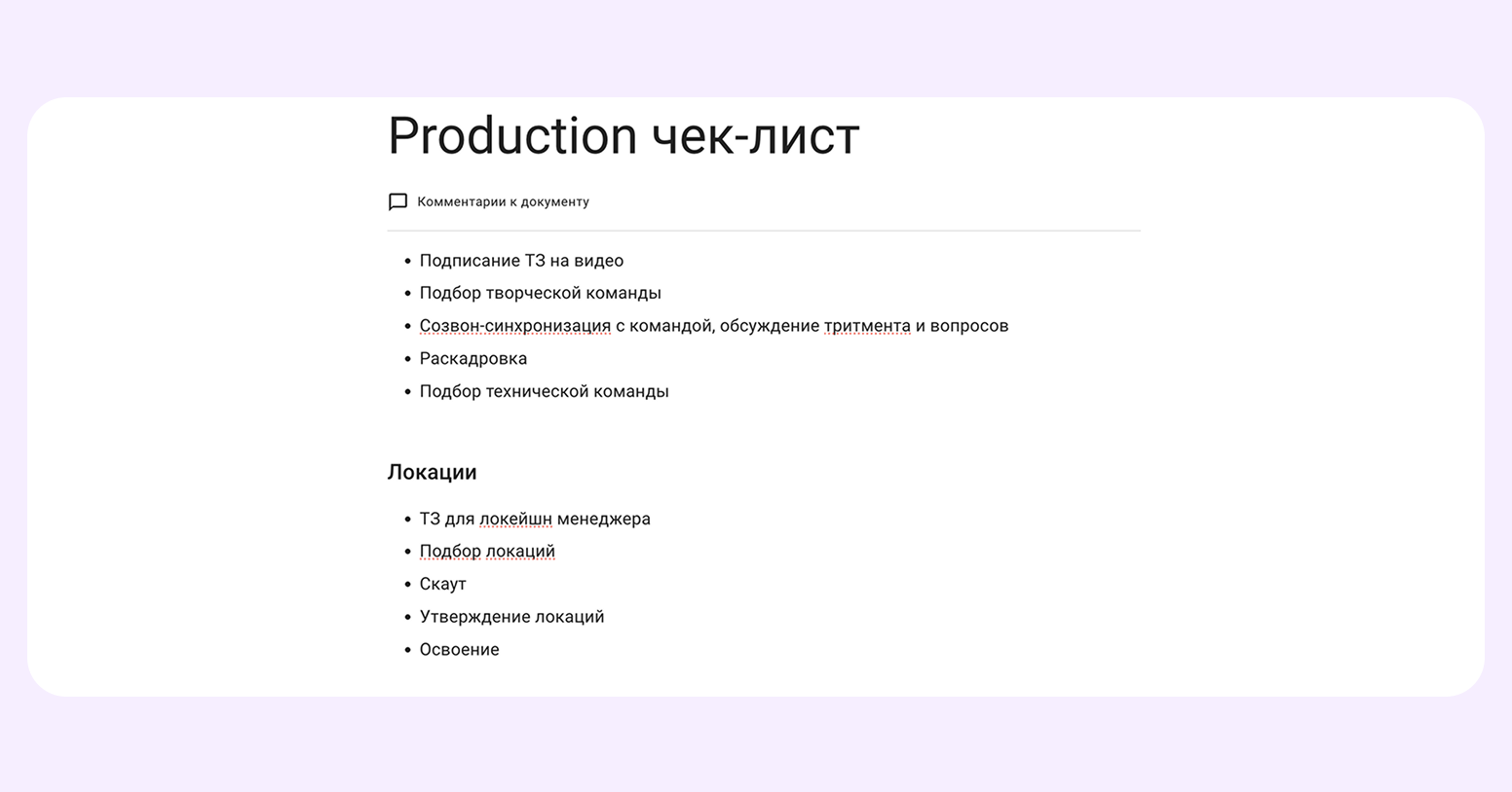 Команда пробовала добавлять разные фичи и настройки. Например, создавала единый документ по производству роликов — «Production чек-лист». Но на практике оказалось, что сотрудникам он не нужен — все и так знают описанный процесс.