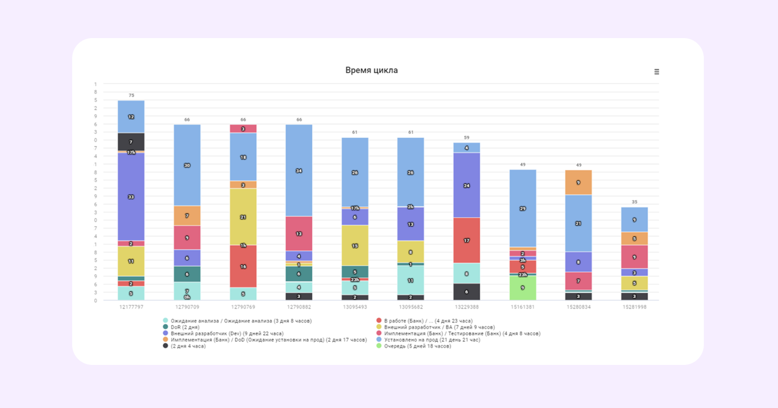 Время нахождения на этапе (Cycle Time). Отслеживает, сколько времени задача представителя когорты провела на каждом этапе. Если сравнить эти данные для разных когорт, вы увидите, какая группа быстрее проходит определенные этапы.